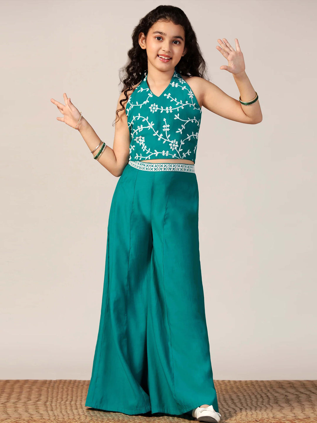 Green color Girls Top with Bottom in Blended fabric with Embroidered work
