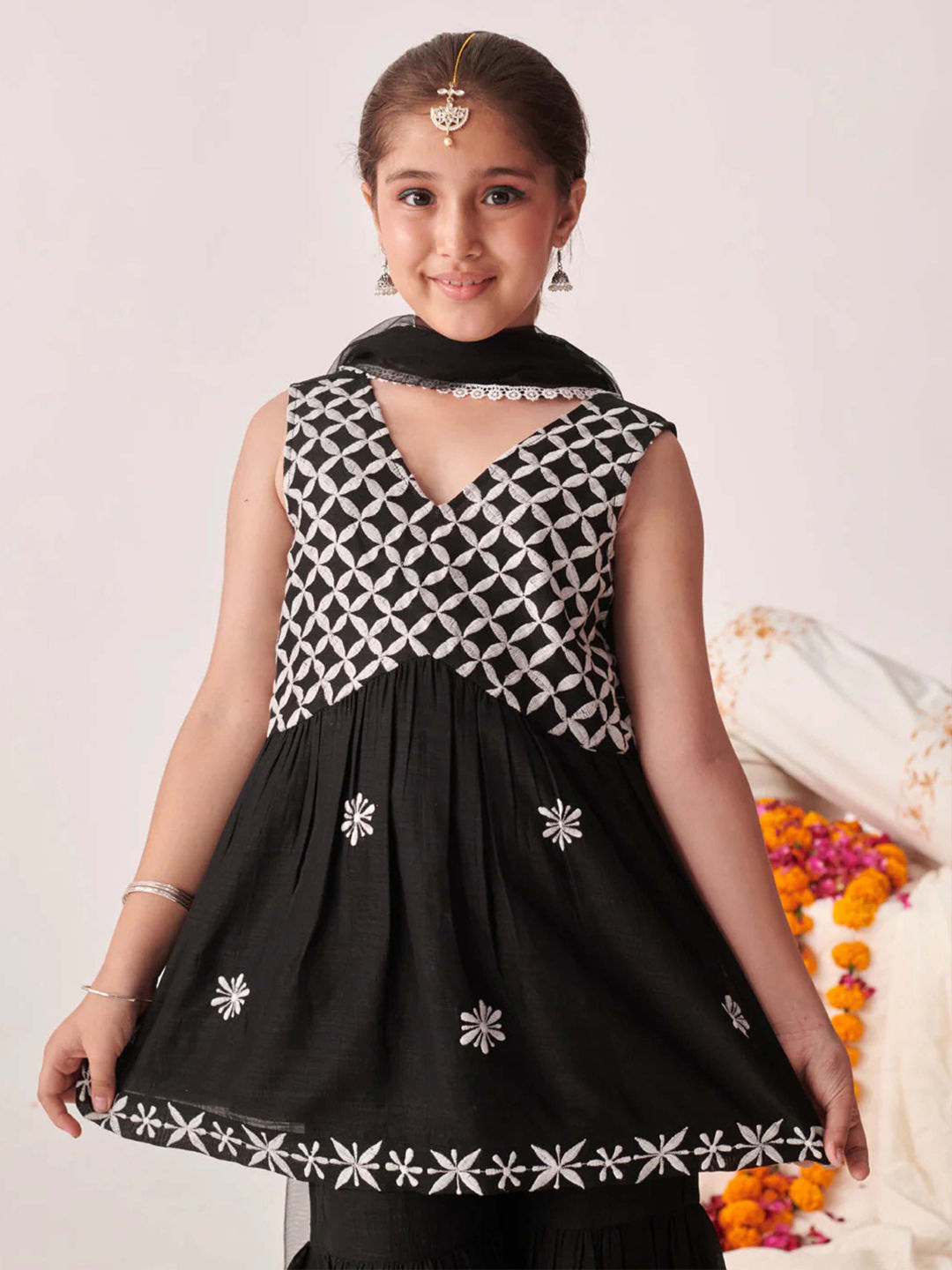 Black and Grey color Kids Salwar in Blended fabric with Embroidered, Lace work