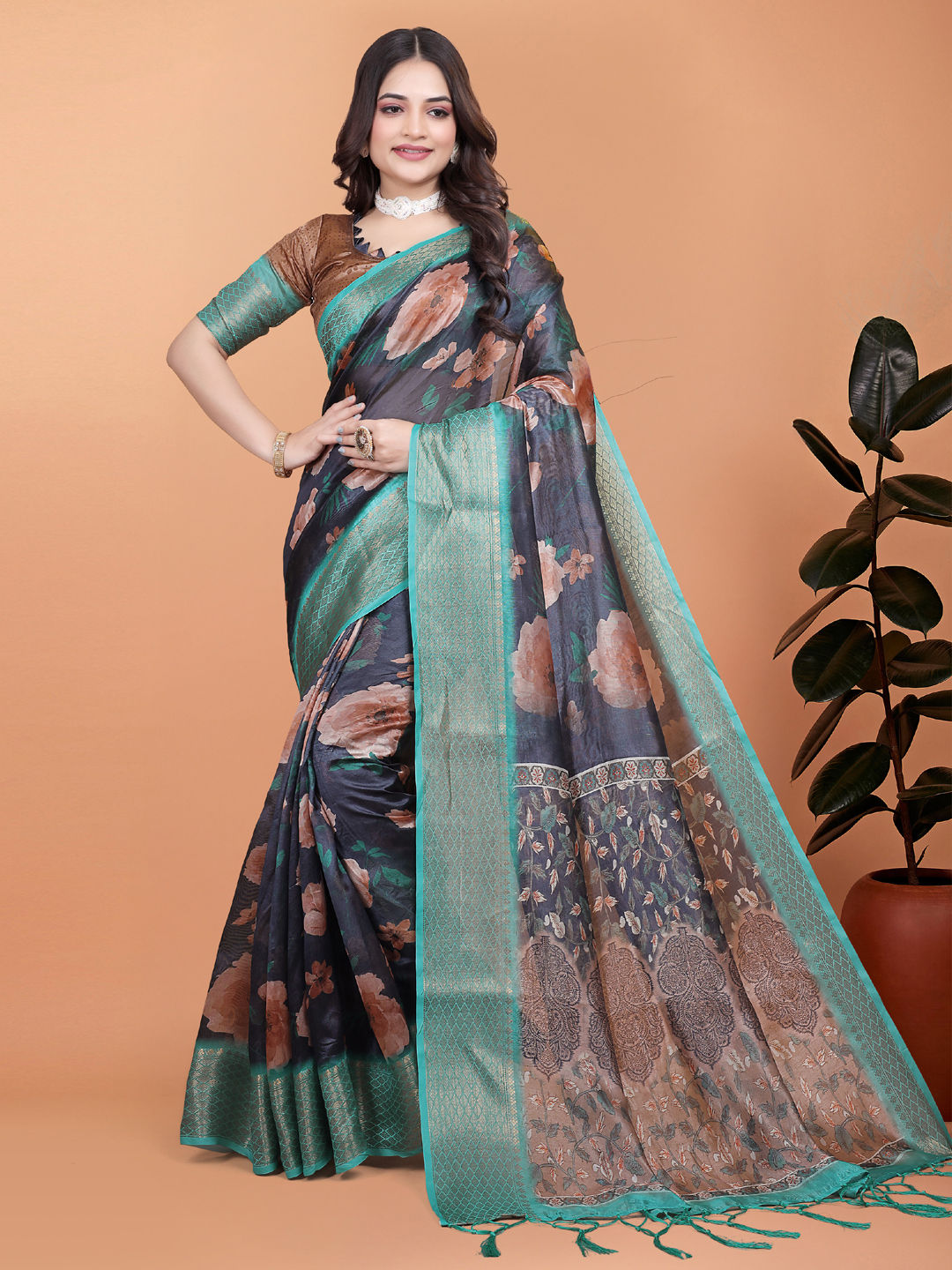 Blended Festive Saree in Black and Grey with Printed work