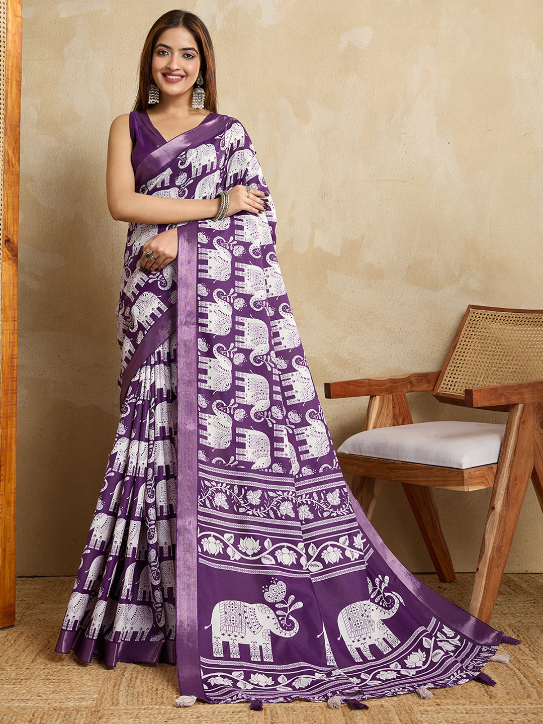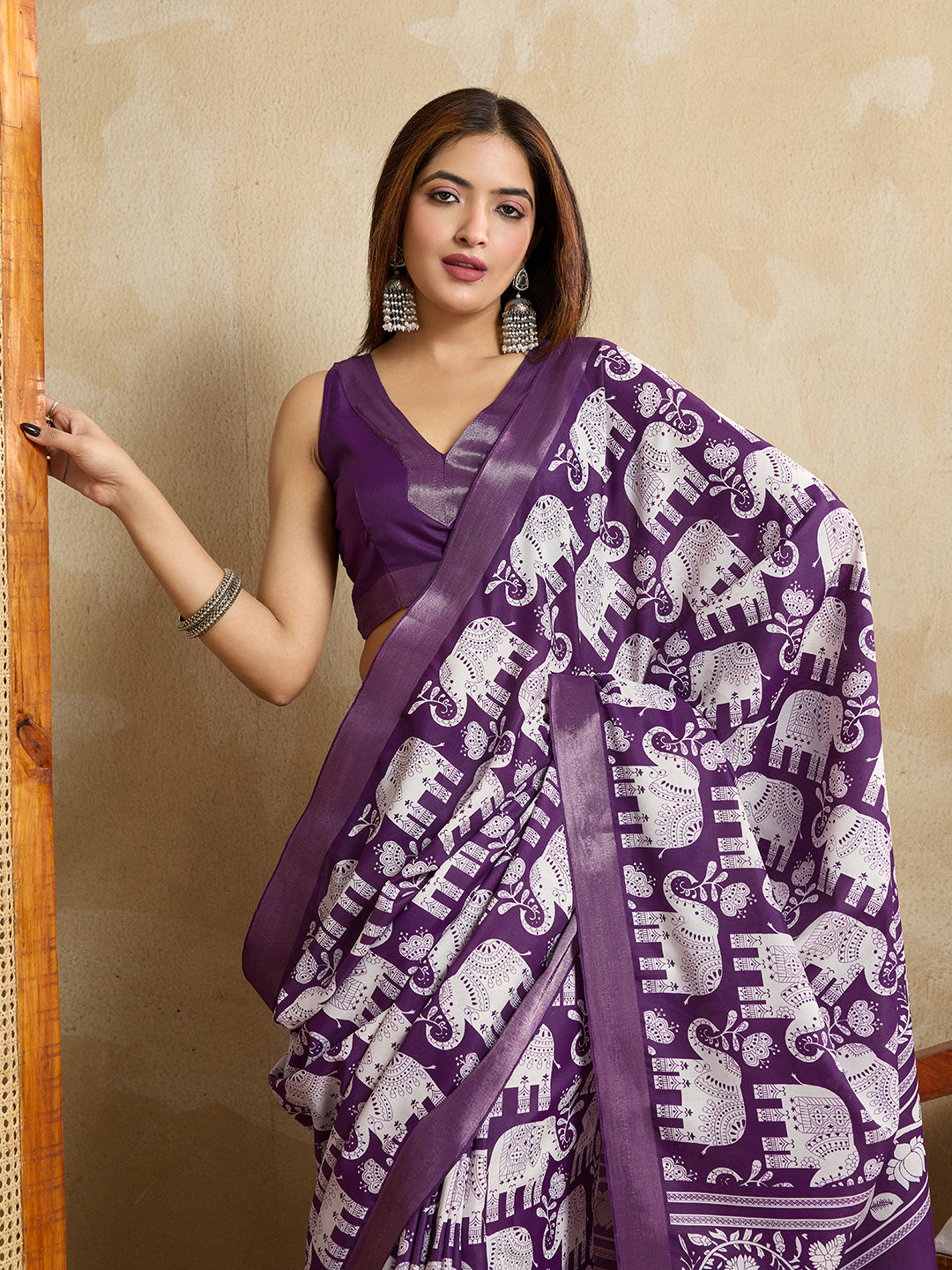 Purple and Violet color Saree in Blended fabric with Digital Print, Zari work