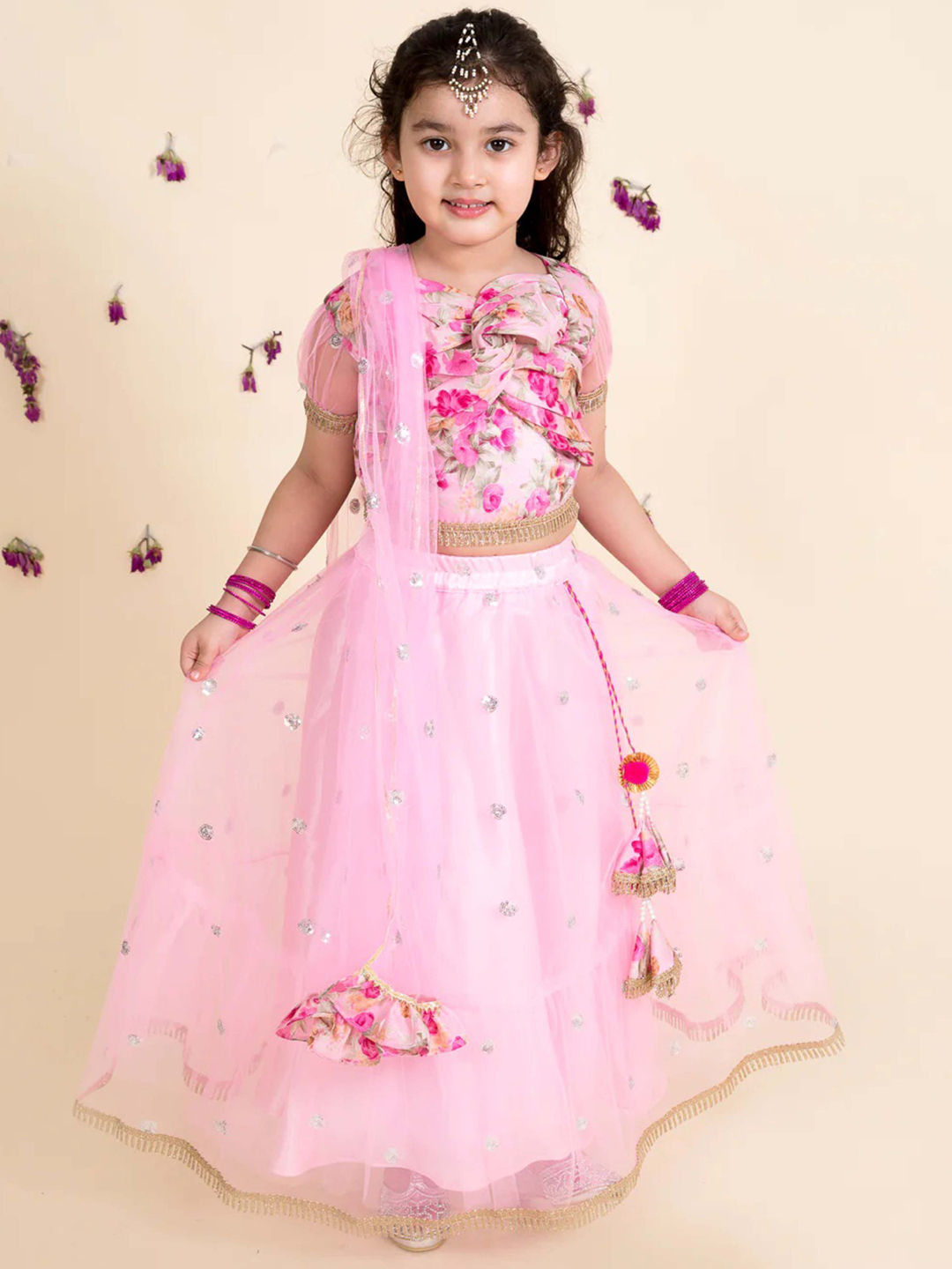 Pink and Majenta color Kids Lehenga in Blended fabric with Floral, Lace, Printed work