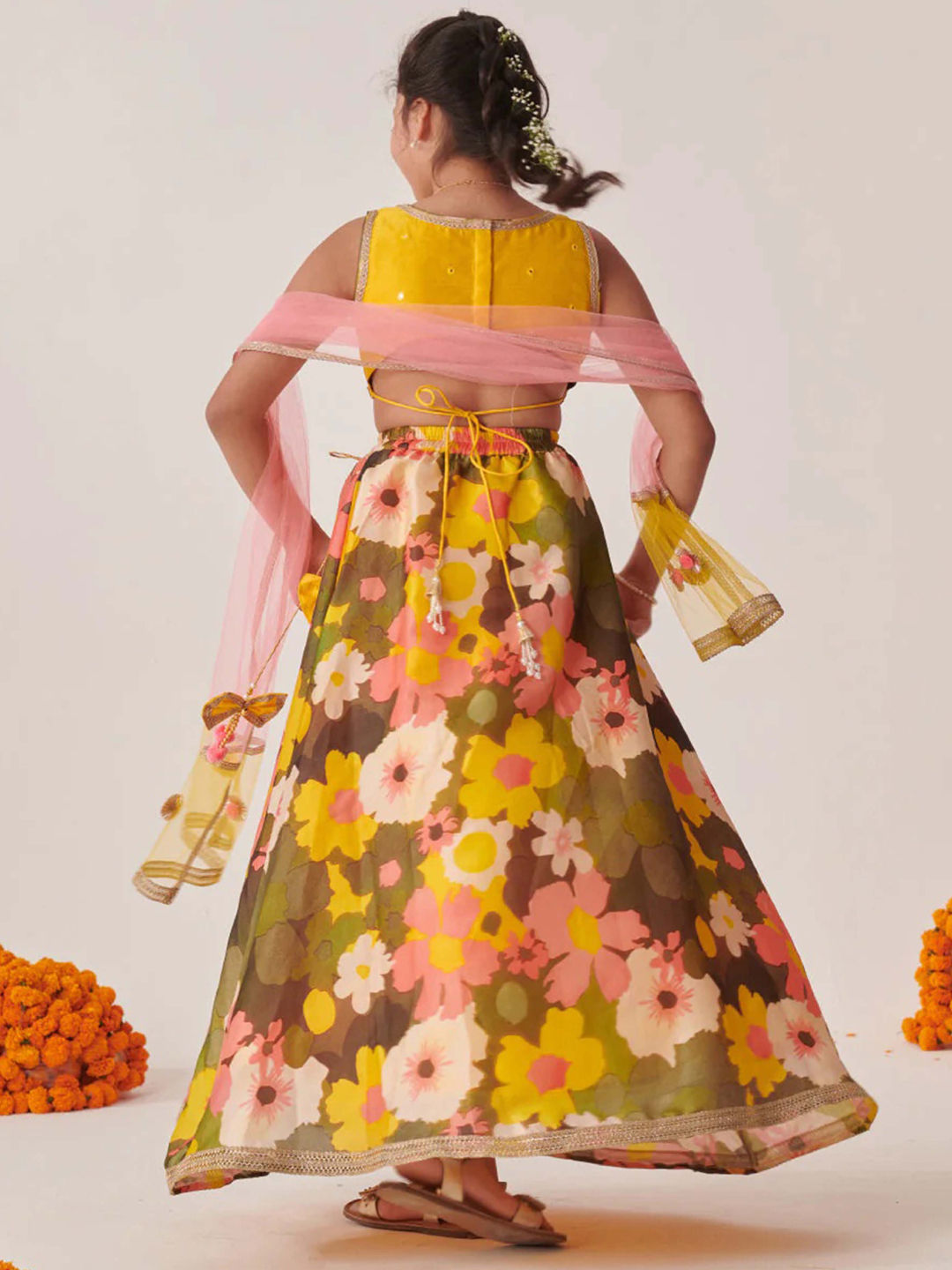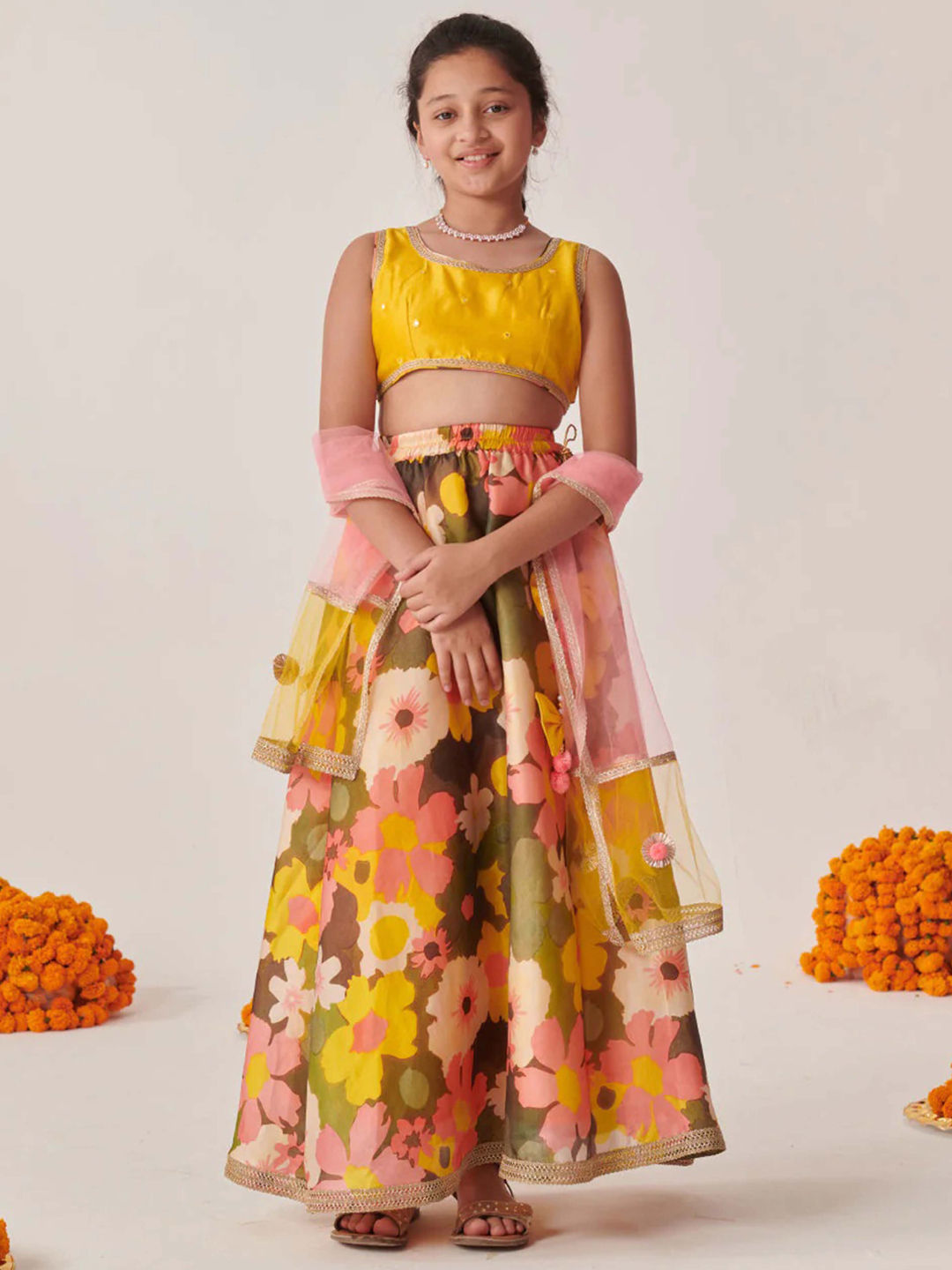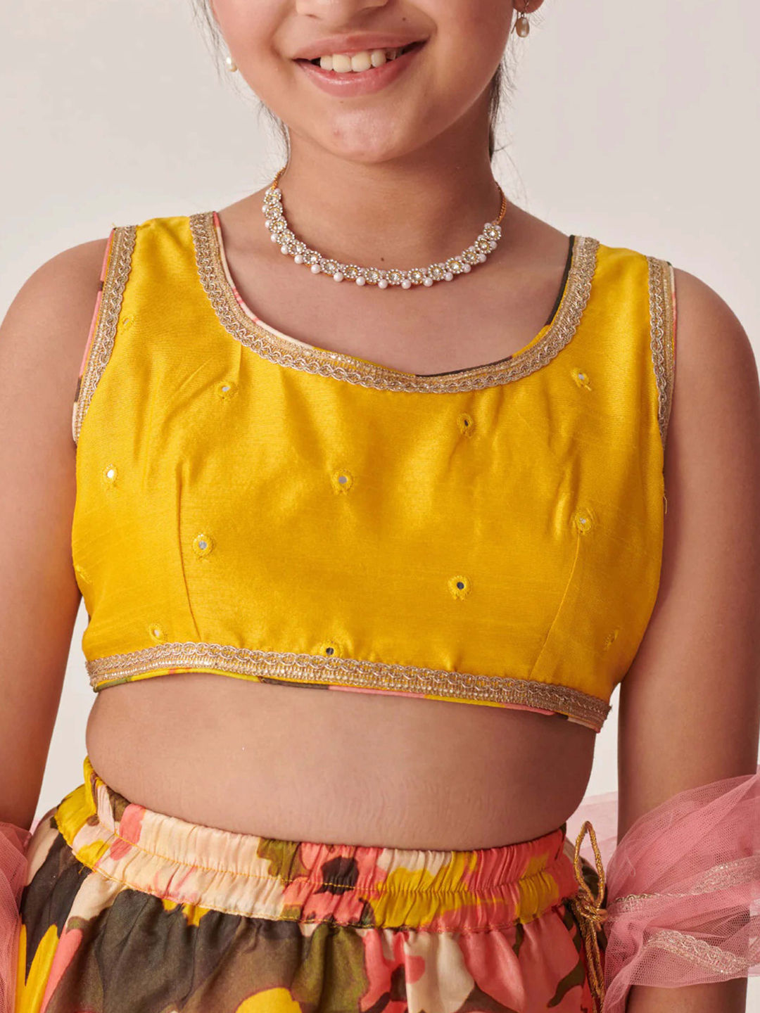 Yellow color Kids Lehenga in Blended fabric with Floral, Lace, Printed work