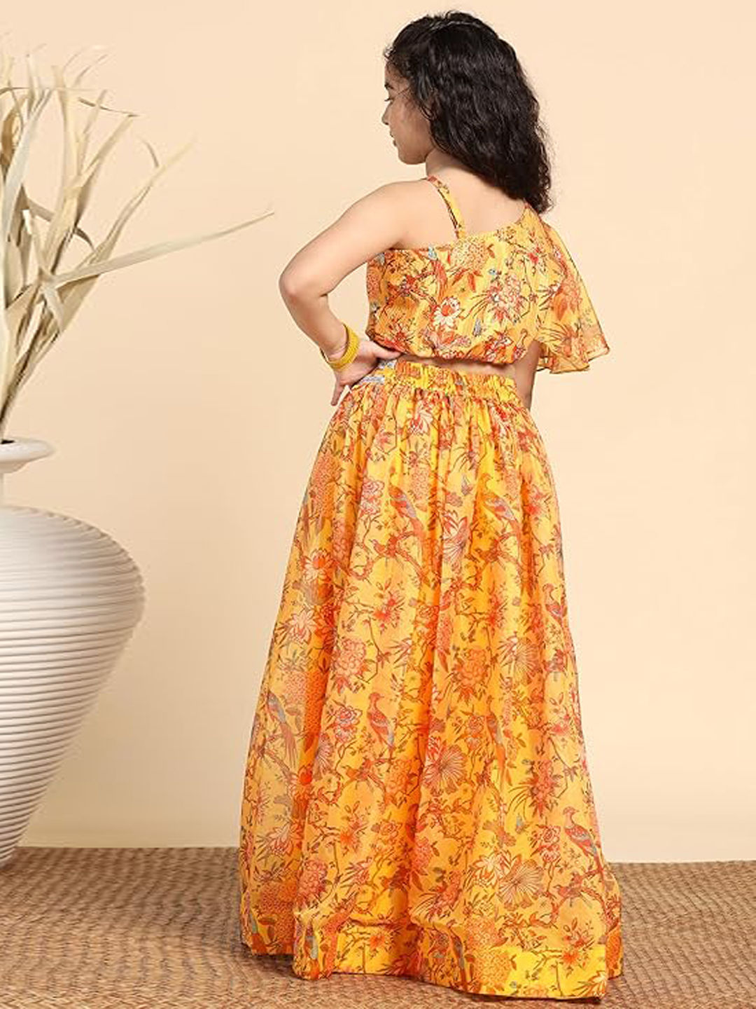 Yellow color Kids Lehenga in Blended fabric with Floral, Lace, Printed work