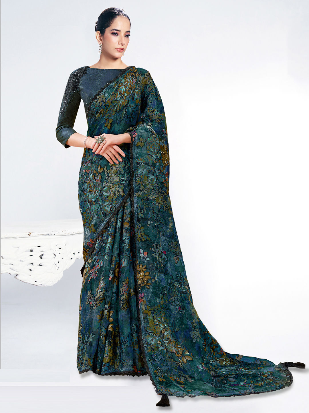 Blue color Saree in Brasso fabric with Digital Print, Embroidered, Stone work