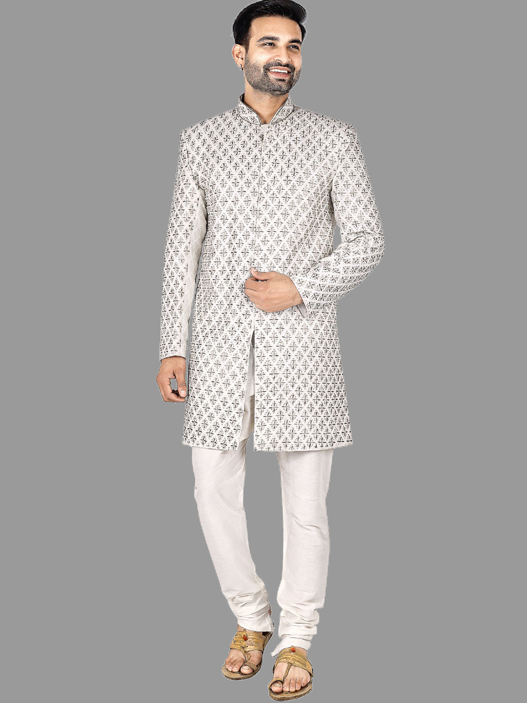 Brocade Festive IndoWestern Dress in White and Off White with Bugle Beads work