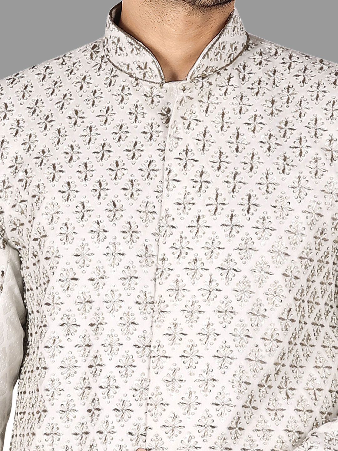 White and Off White color IndoWestern Dress in Brocade fabric with Bugle Beads, Cut Dana, Zardozi work