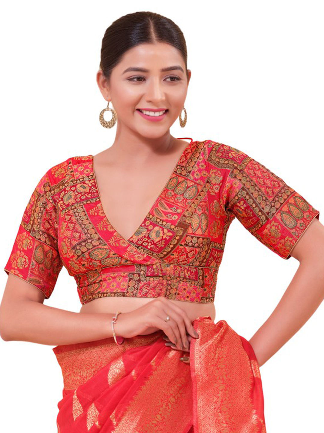 Red and Maroon color Blouse in Brocade fabric with Weaving work