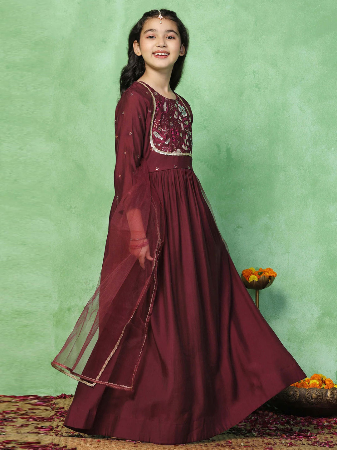 Chanderi Silk Festive Girls Dress in Red and Maroon with Embroidered work