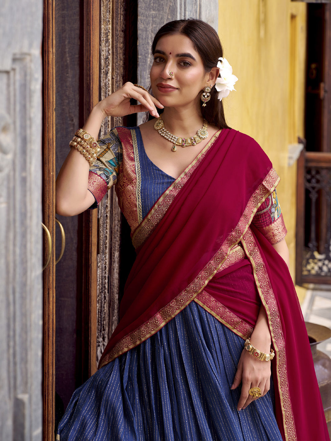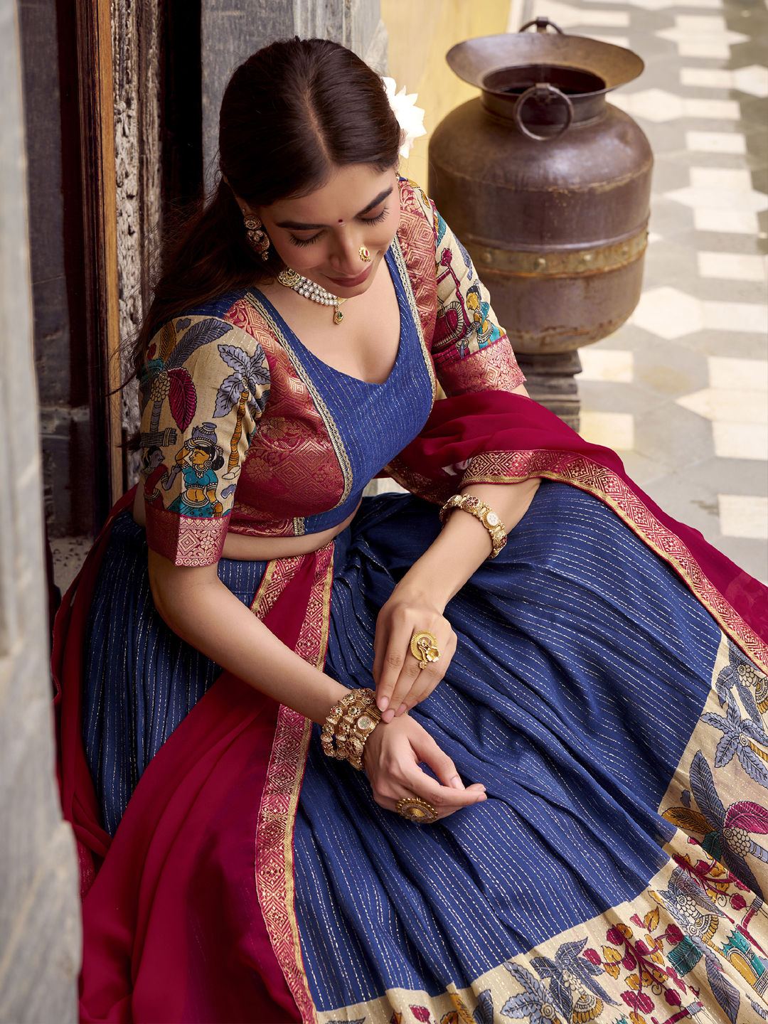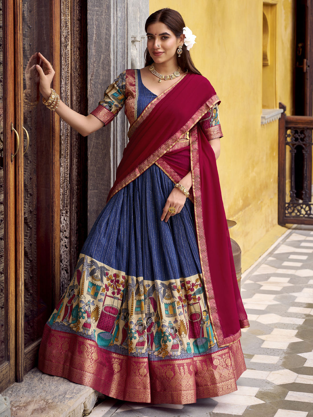 Blue color Lehenga in Chanderi Silk fabric with Printed, Weaving work