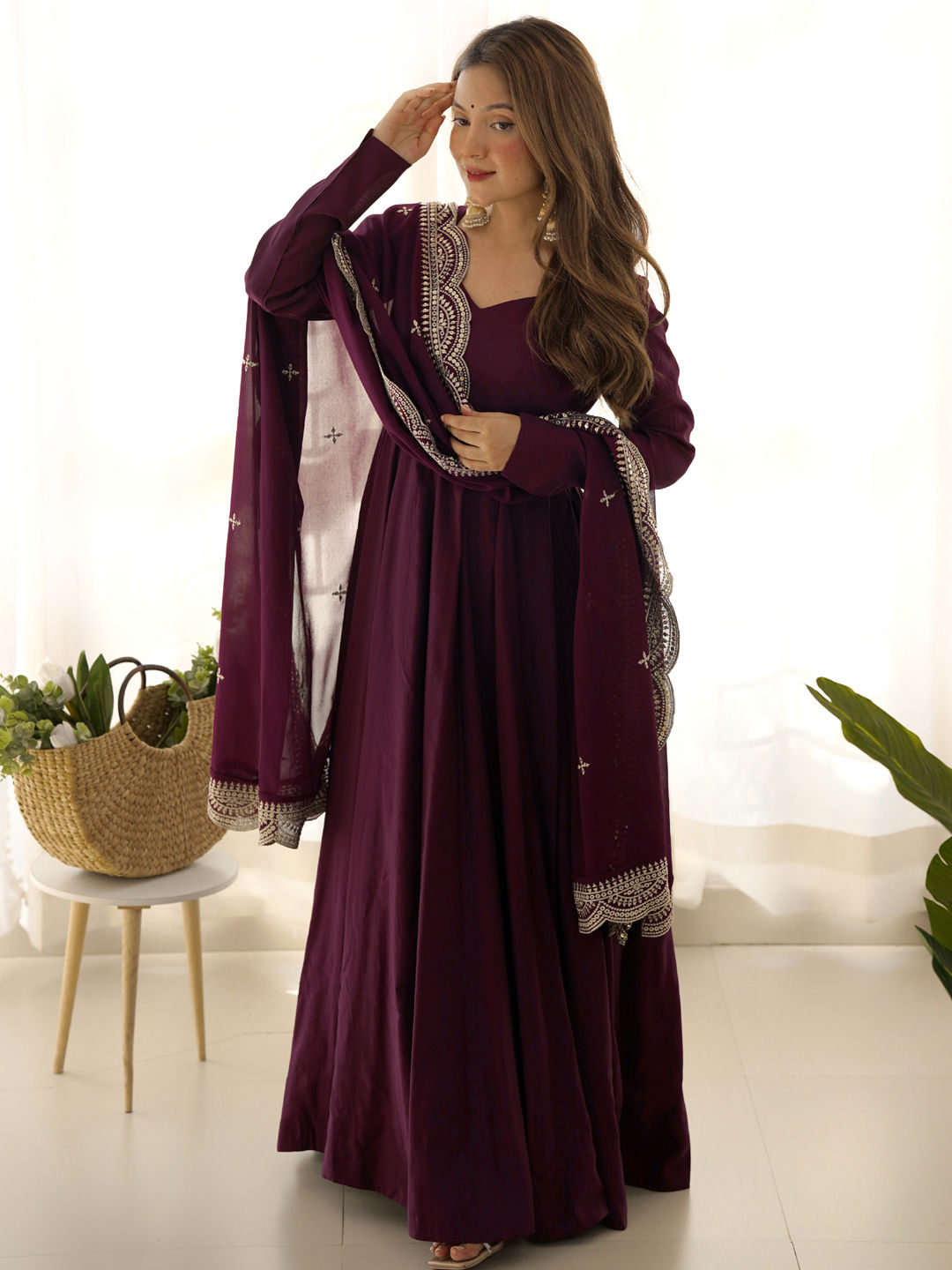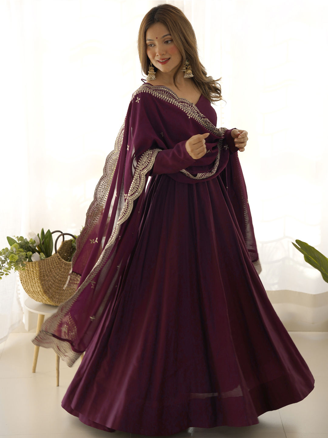 Beige and Brown color Salwar Kameez in Chanderi Silk, Roman Silk fabric with Sequence, Thread work