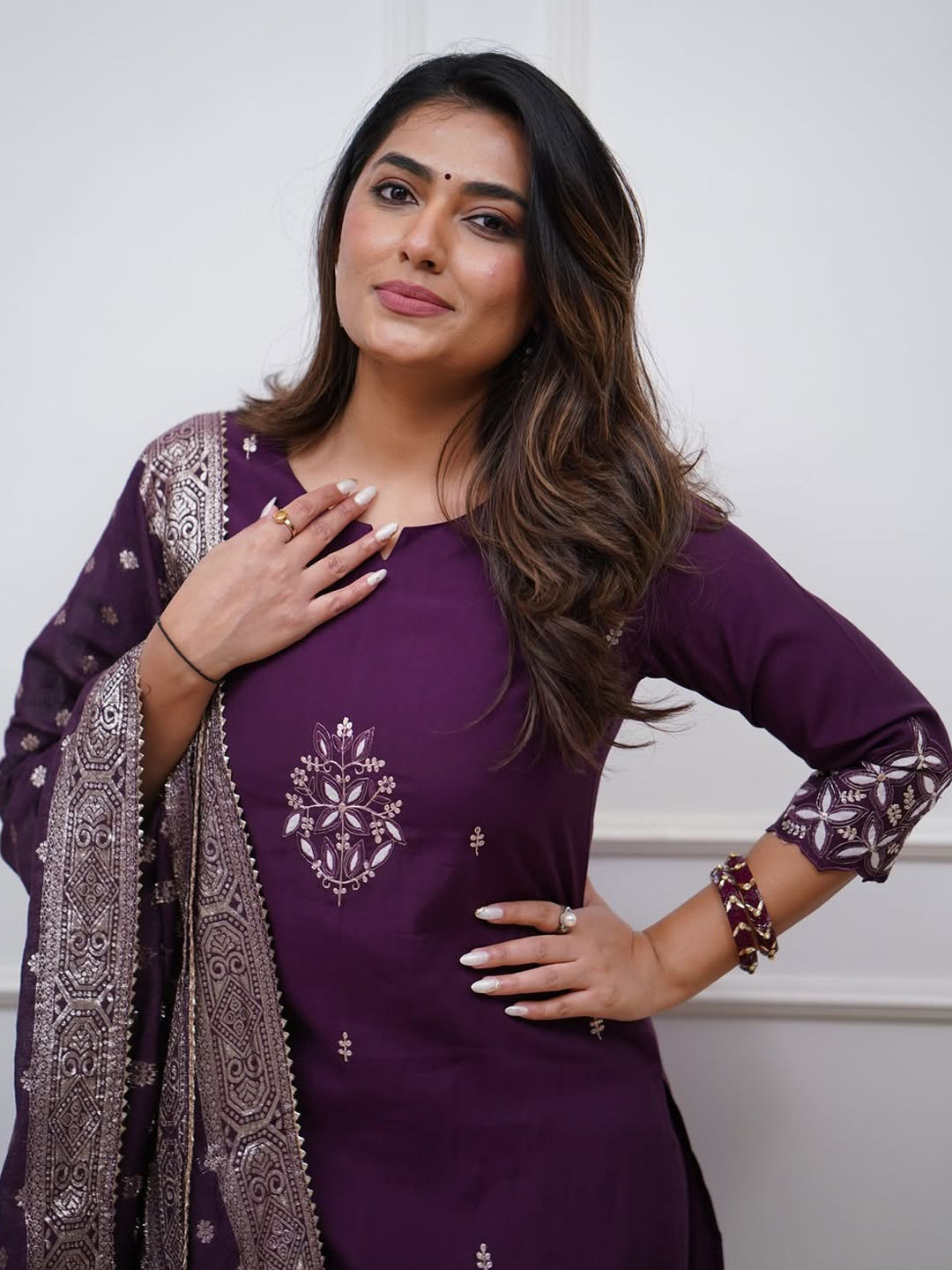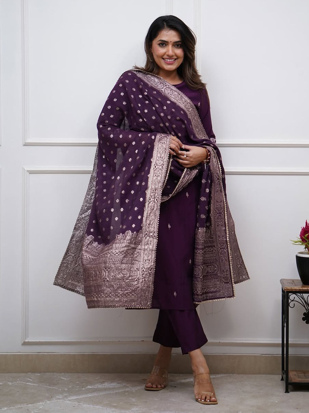 Purple and Violet color Salwar Kameez in Chanderi Silk fabric with Embroidered work