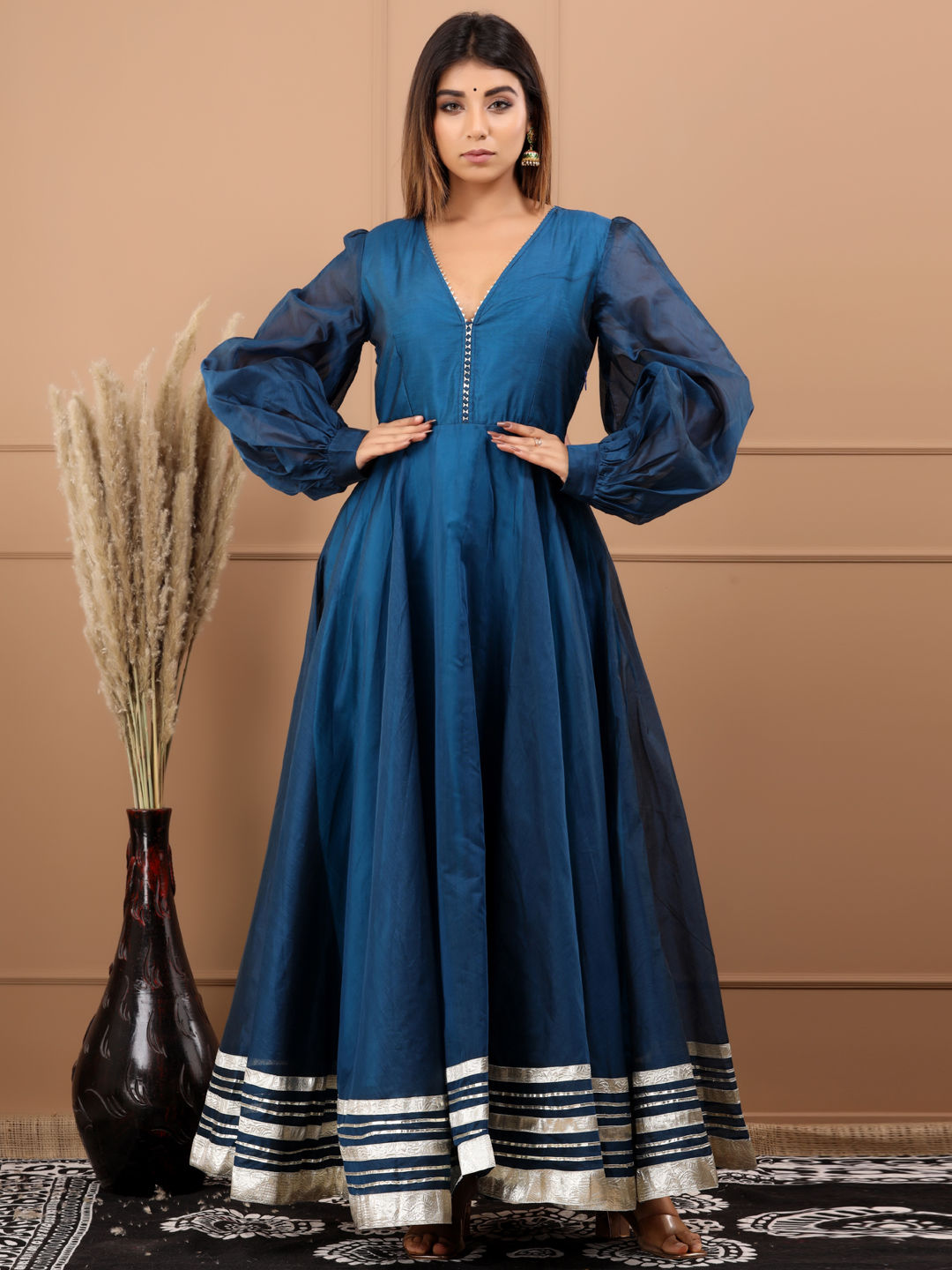 Blue color Dress in Chanderi Silk fabric with Gota Patti work