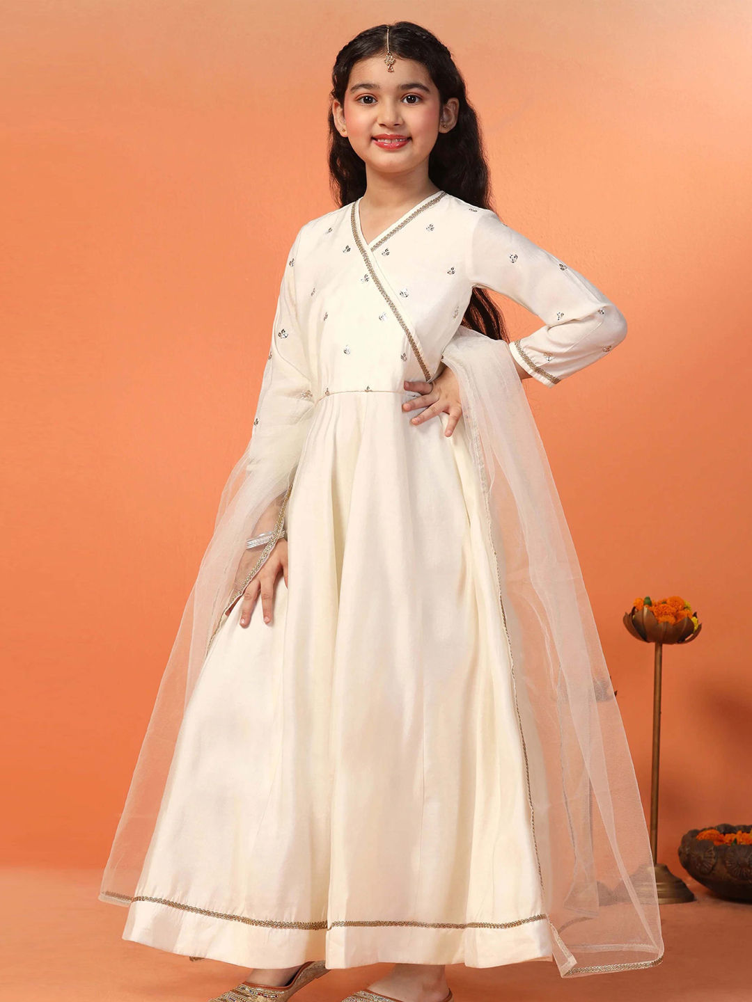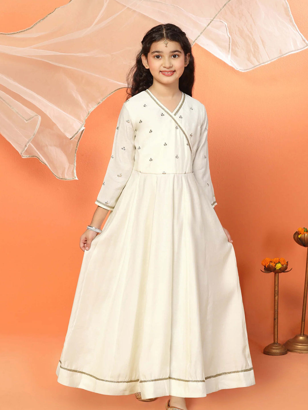 White and Off White color Girls Dress in Chanderi Silk fabric with Embroidered work