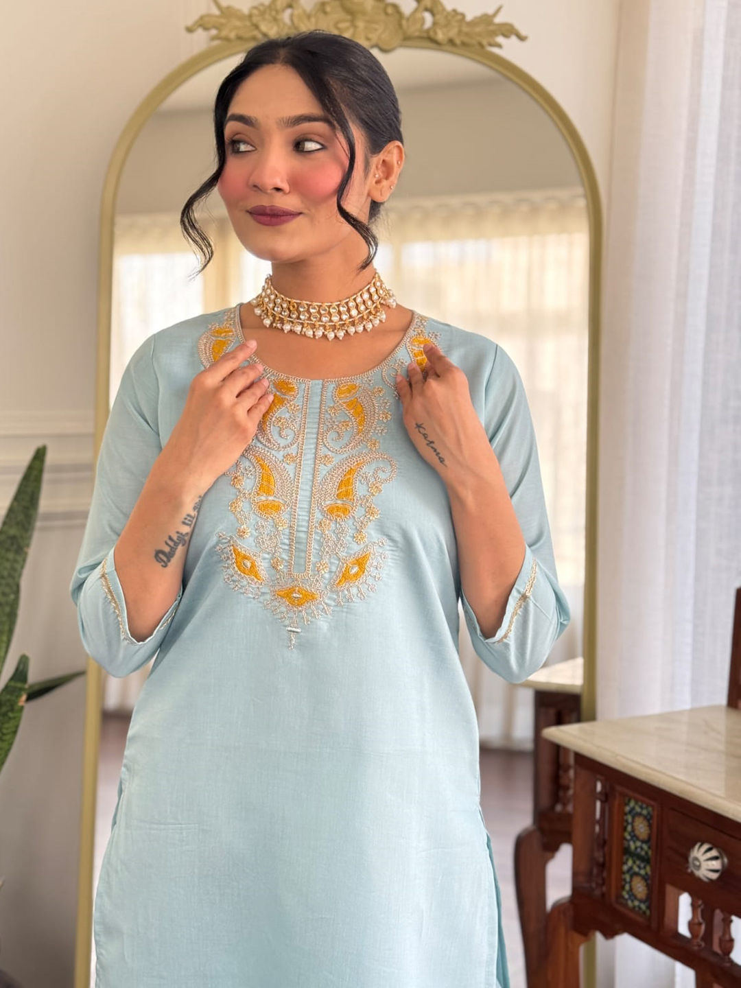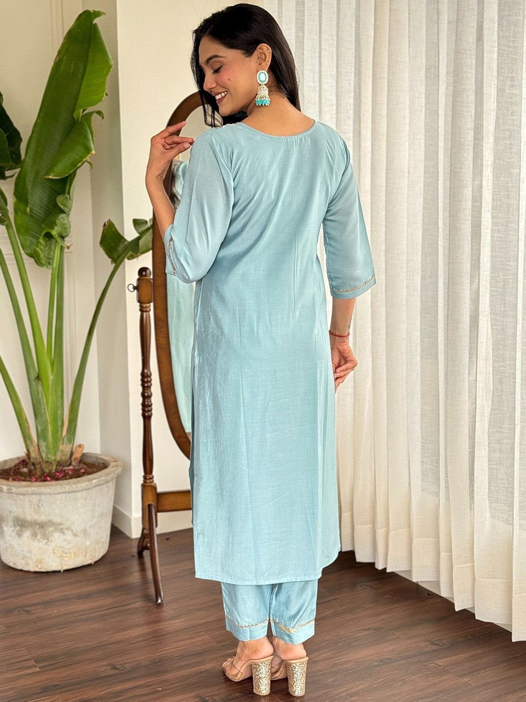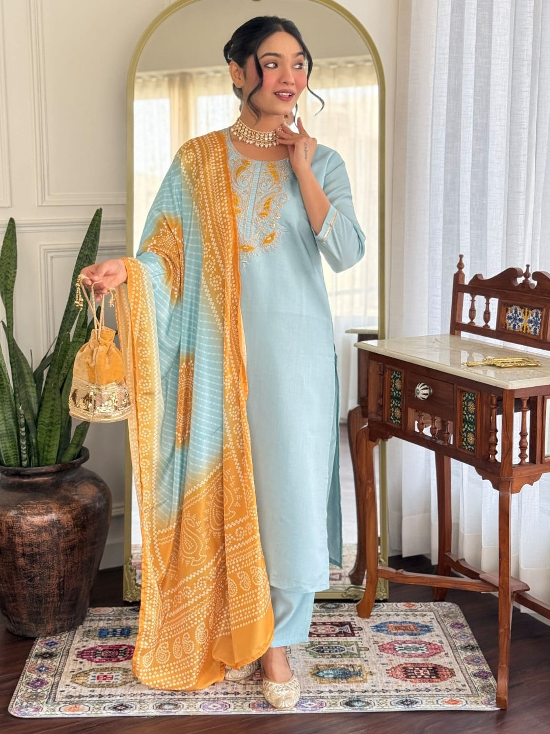 Blue color Salwar Kameez in Chanderi Silk fabric with Embroidered, Thread work