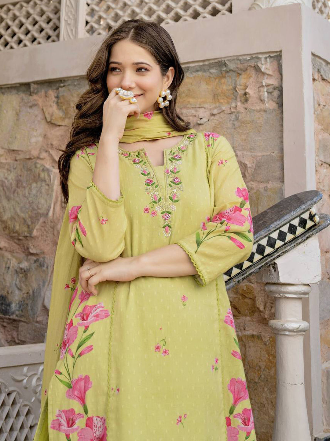 Yellow color Salwar Kameez in Chanderi Silk fabric with Floral, Printed, Weaving work