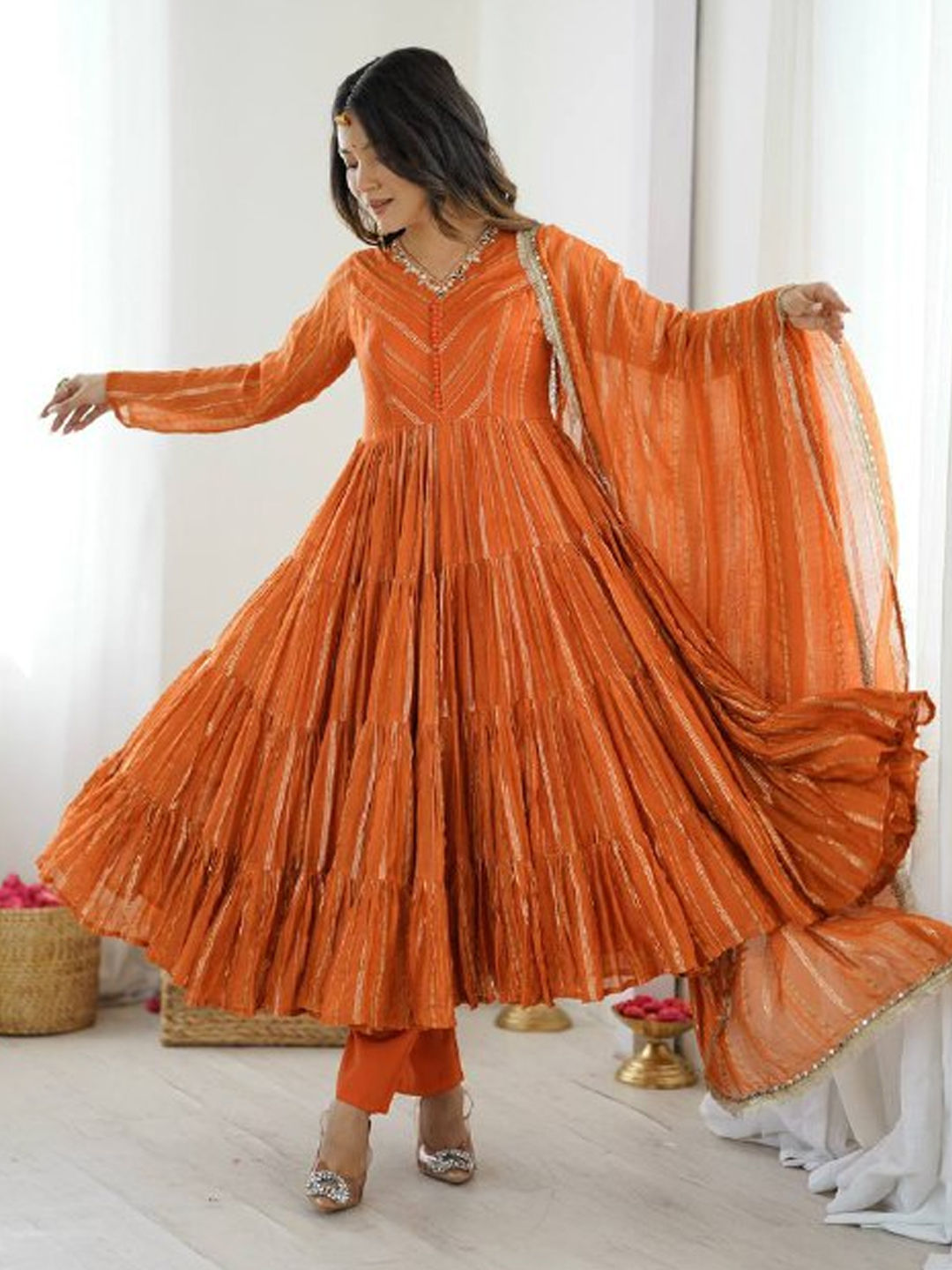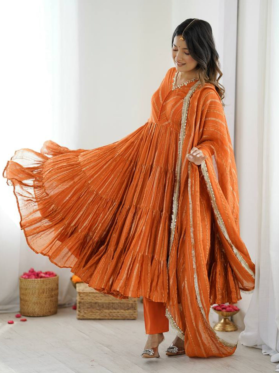 Orange color Salwar Kameez in Chanderi Silk fabric with Lace, Mirror work