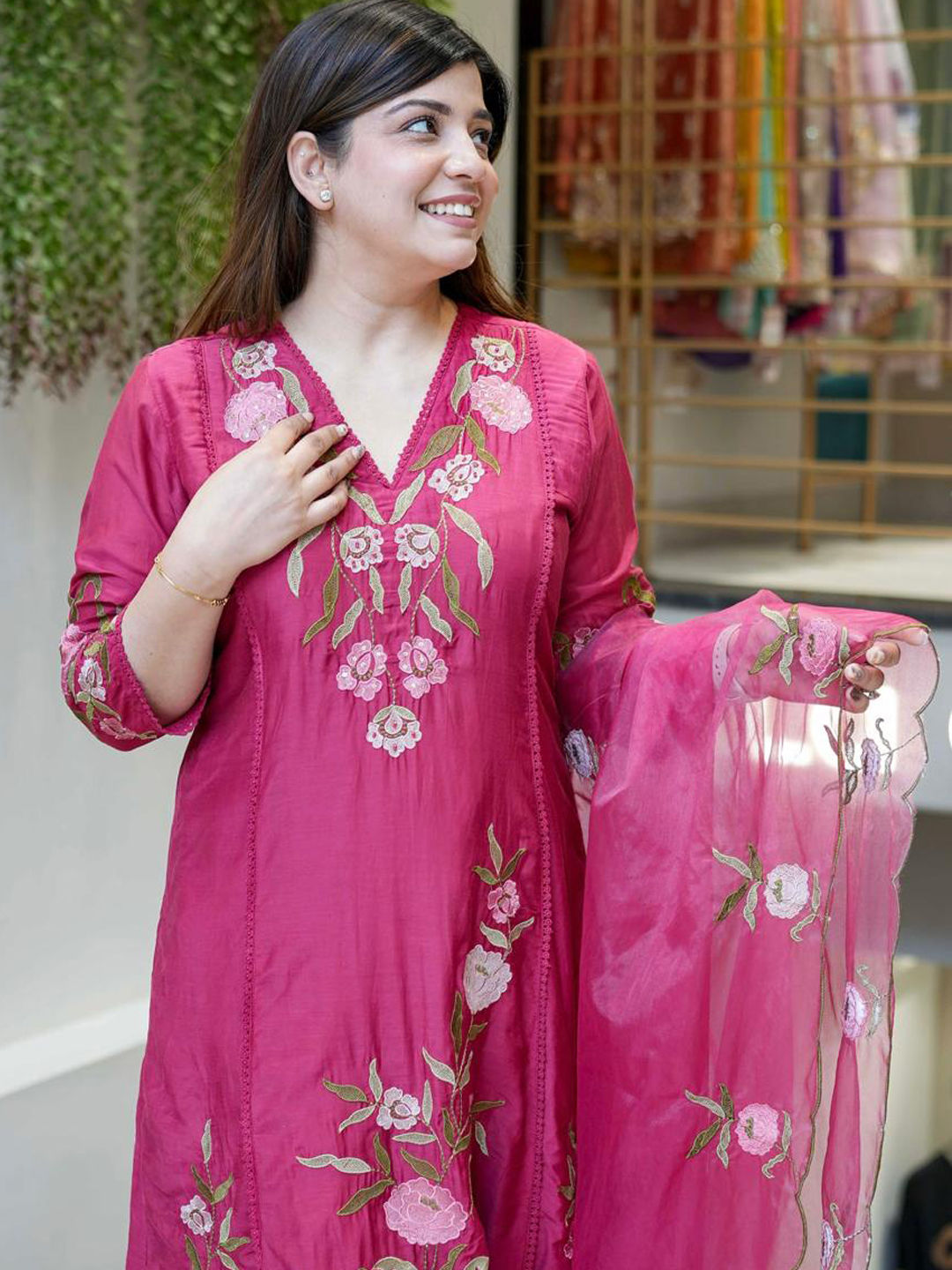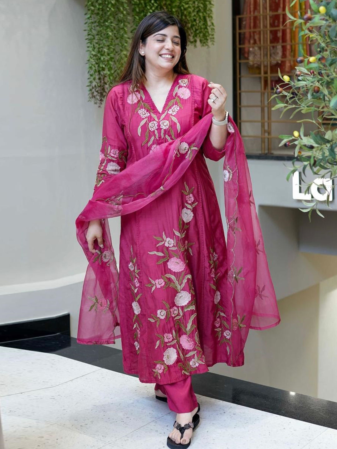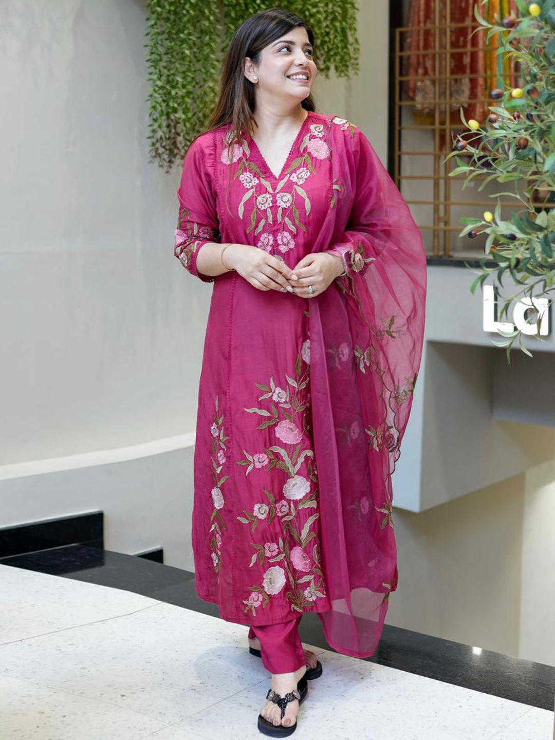Pink and Majenta color Salwar Kameez in Chanderi Silk fabric with Embroidered, Thread work