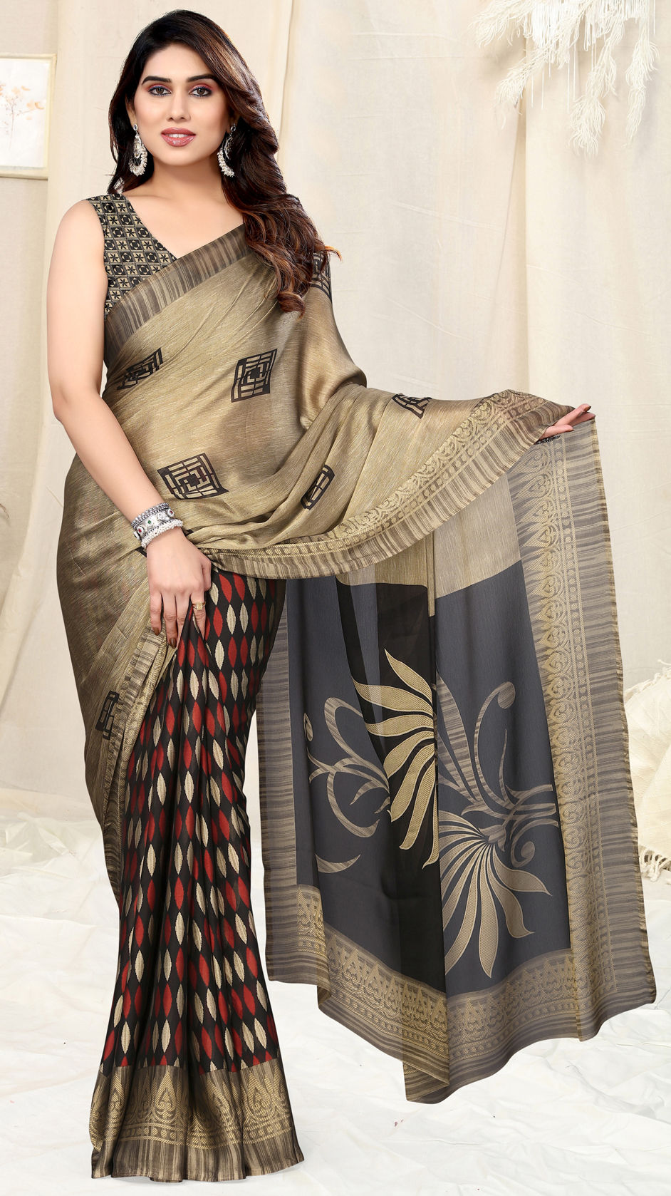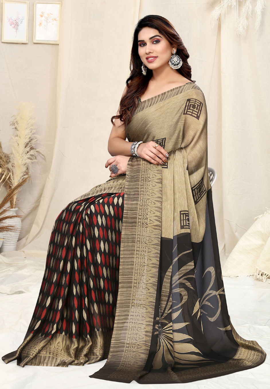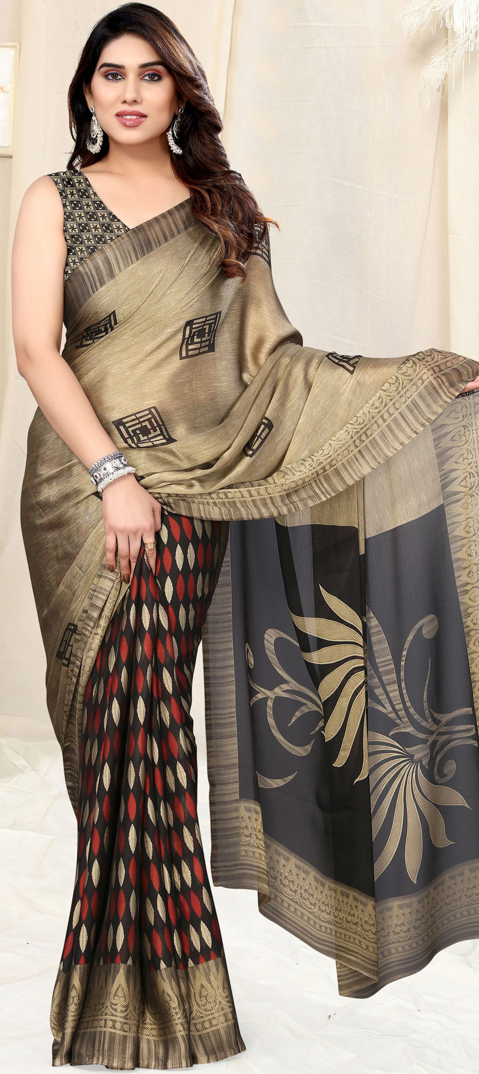 Beige and Brown, Black and Grey color Saree in Chiffon fabric with Printed work