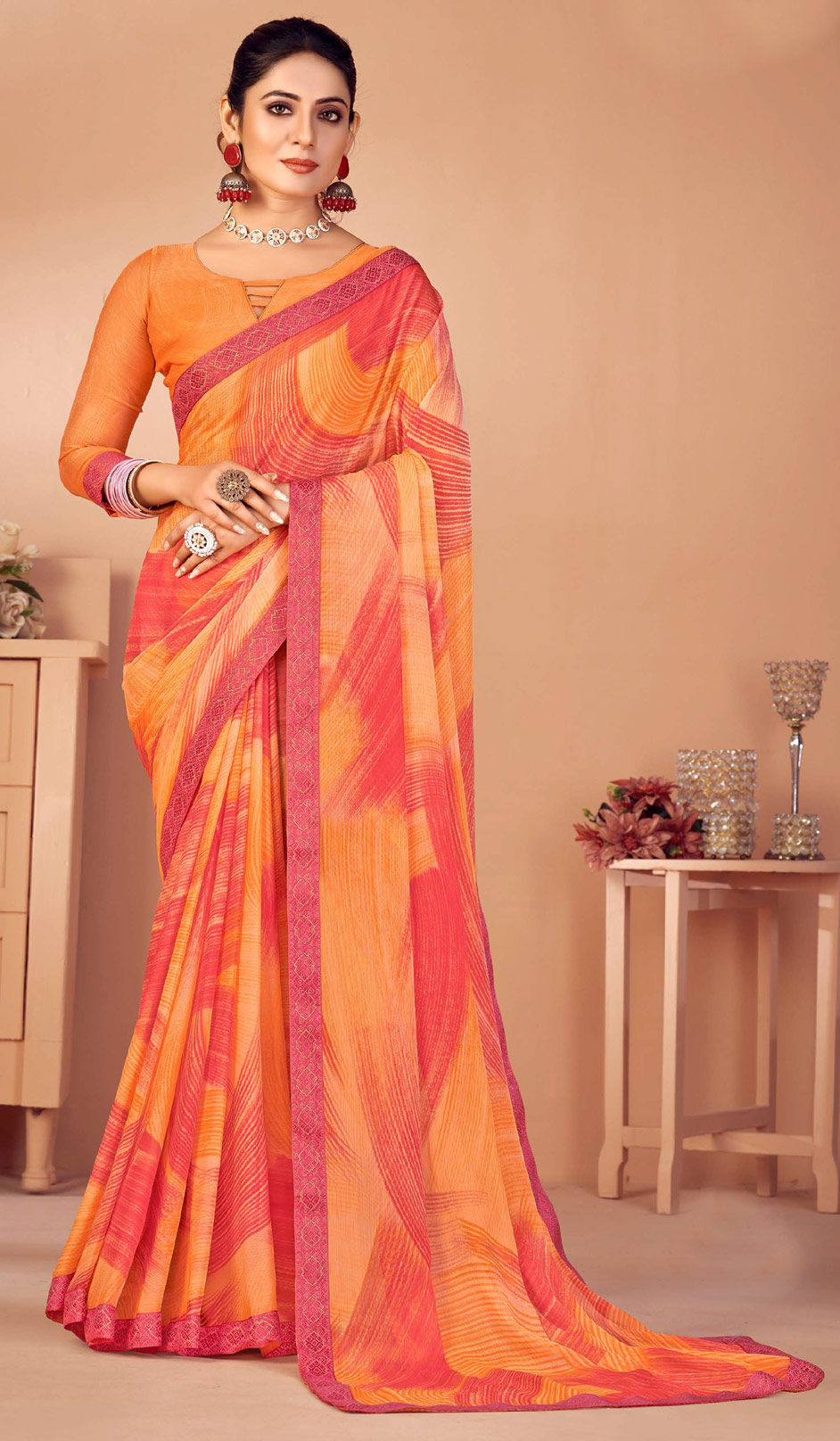 Red and Maroon, Yellow color Saree in Chiffon fabric with Printed work