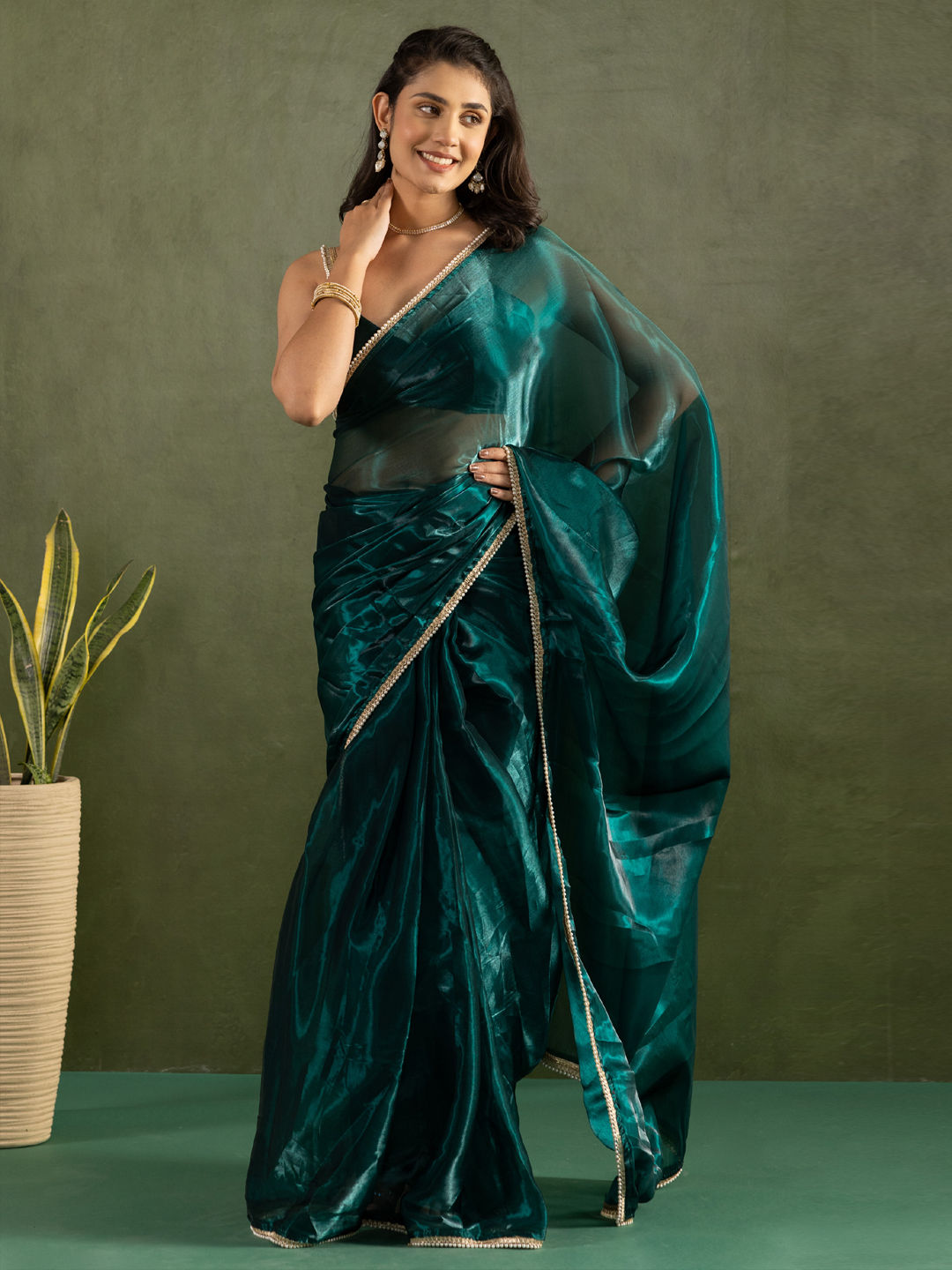 Chiffon Festive Readymade Saree in Green with Lace work