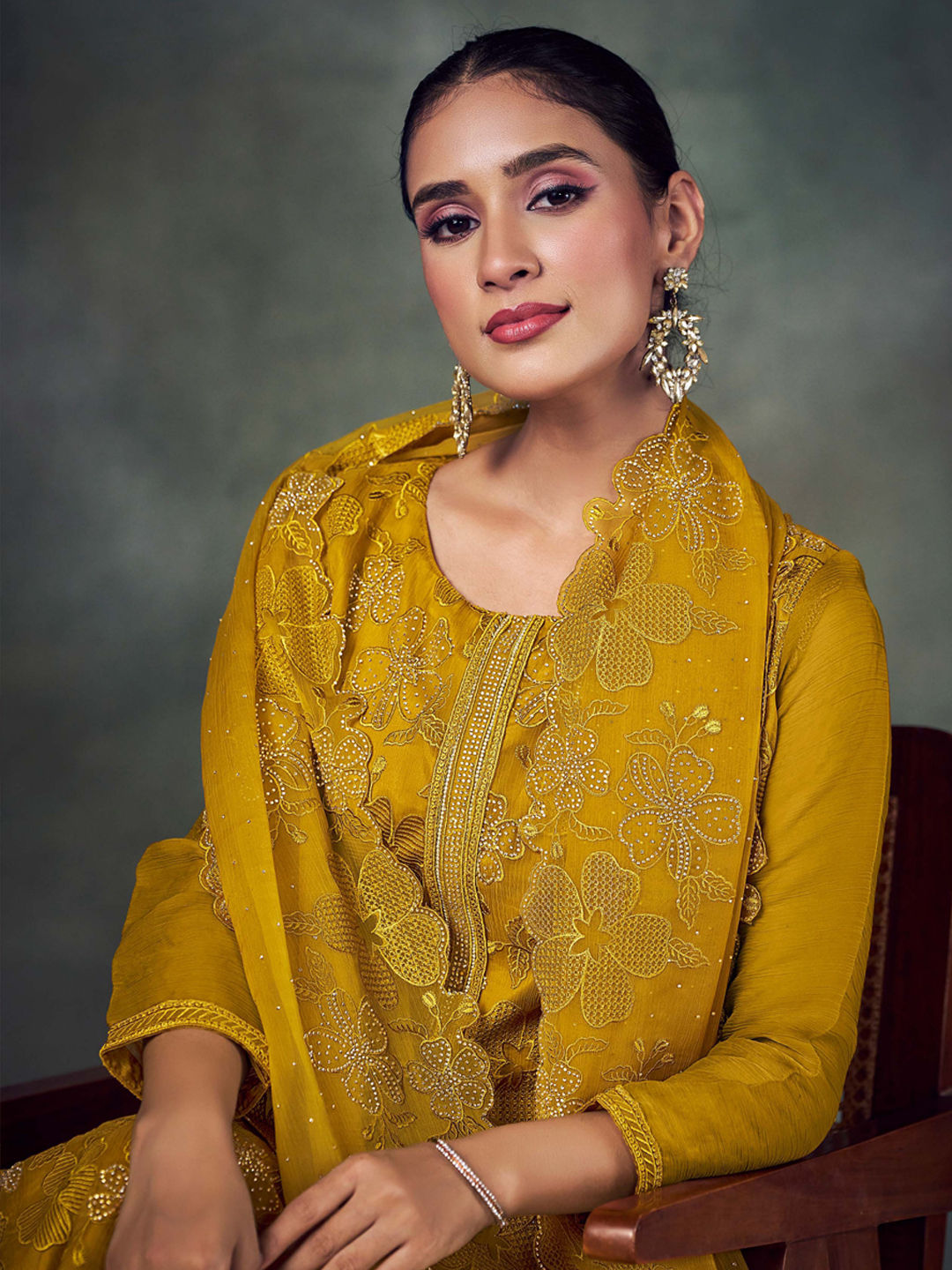 Yellow color Salwar Kameez in Chiffon fabric with Embroidered, Stone, Swarovski, Thread work