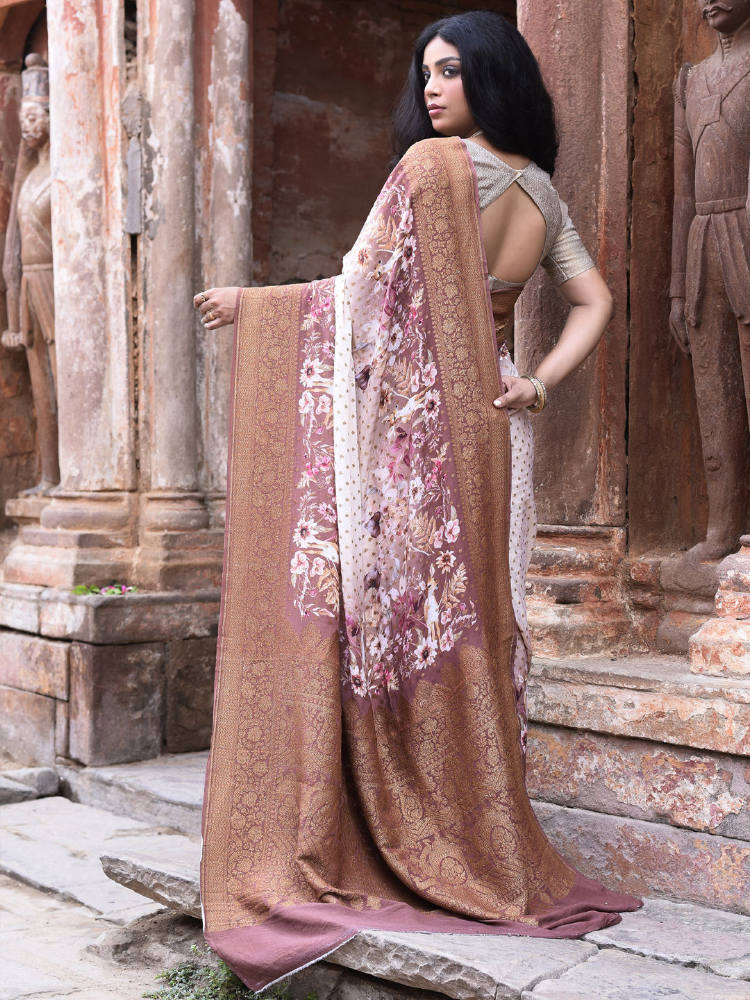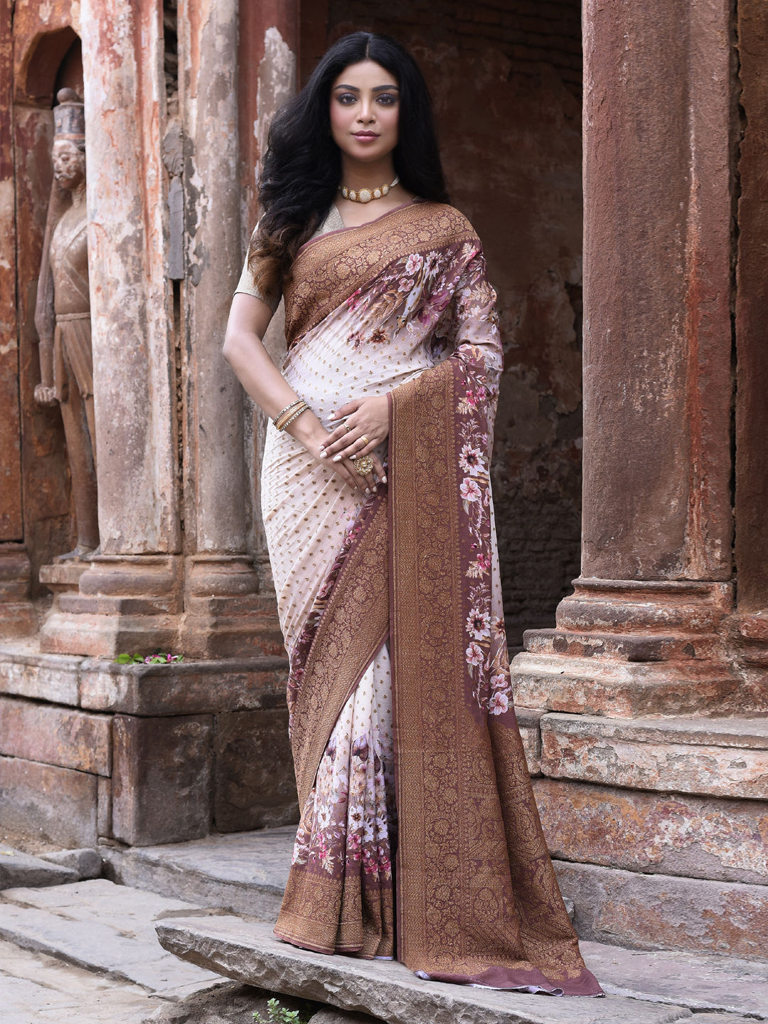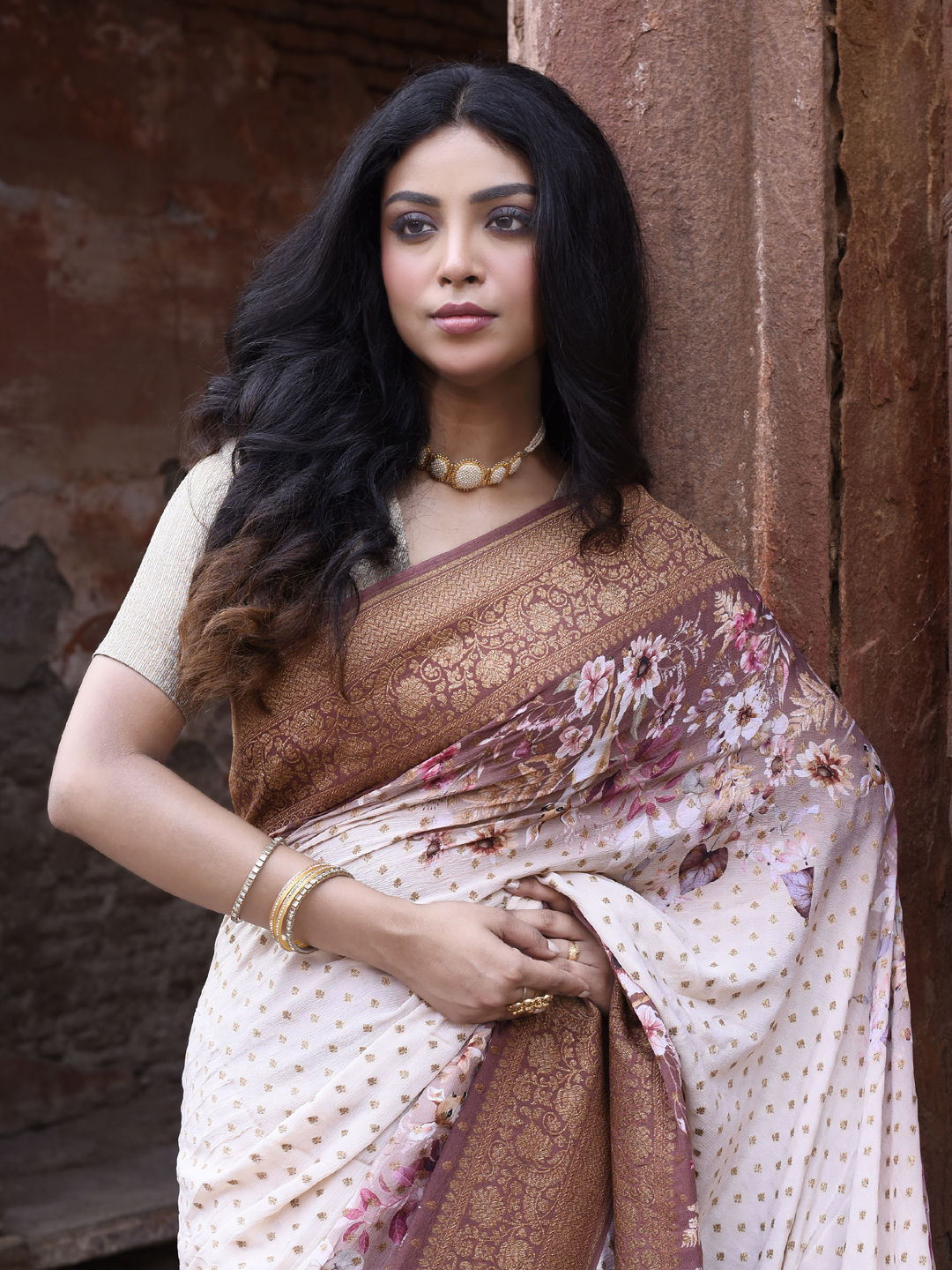 Beige and Brown color Saree in Chiffon, Crepe Silk fabric with Border, Zari work