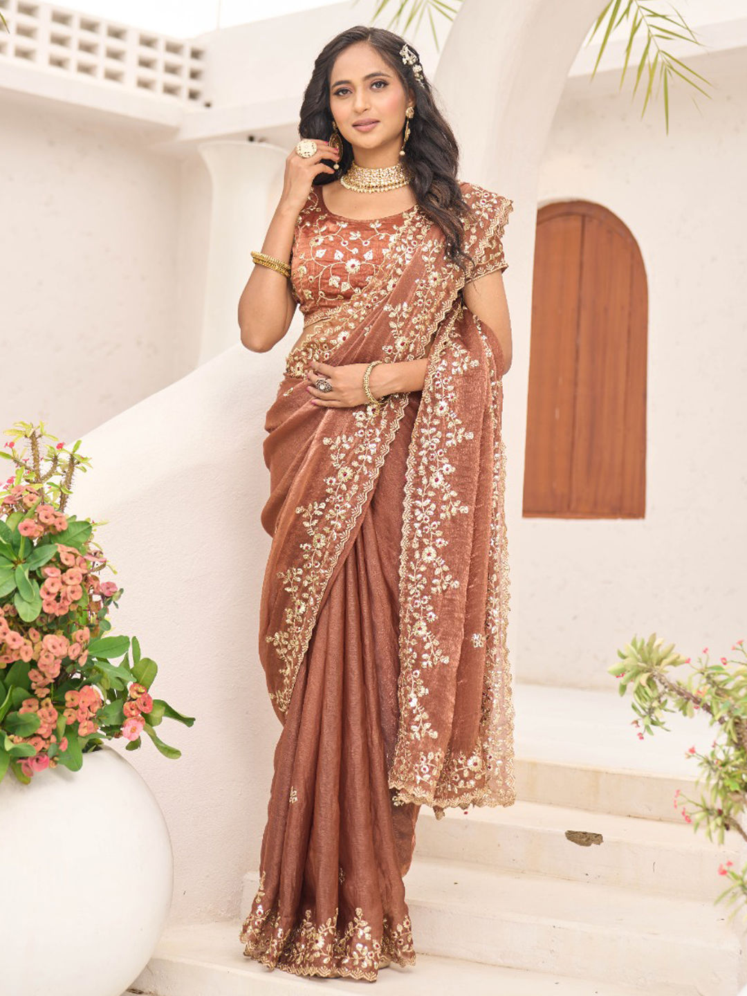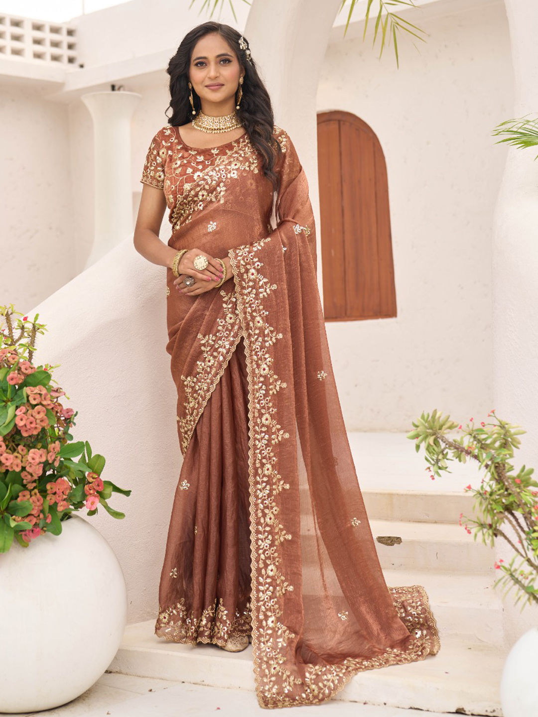 Beige and Brown color Saree in Chiffon fabric with Embroidered, Sequence work