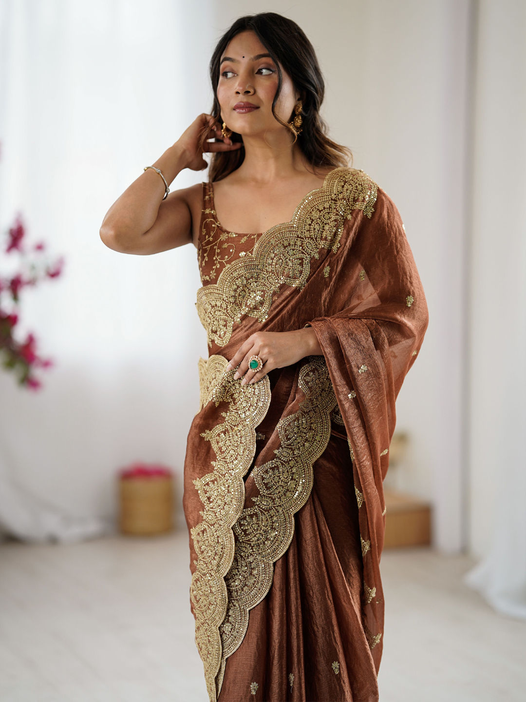 Beige and Brown color Saree in Chiffon fabric with Embroidered, Sequence, Thread work