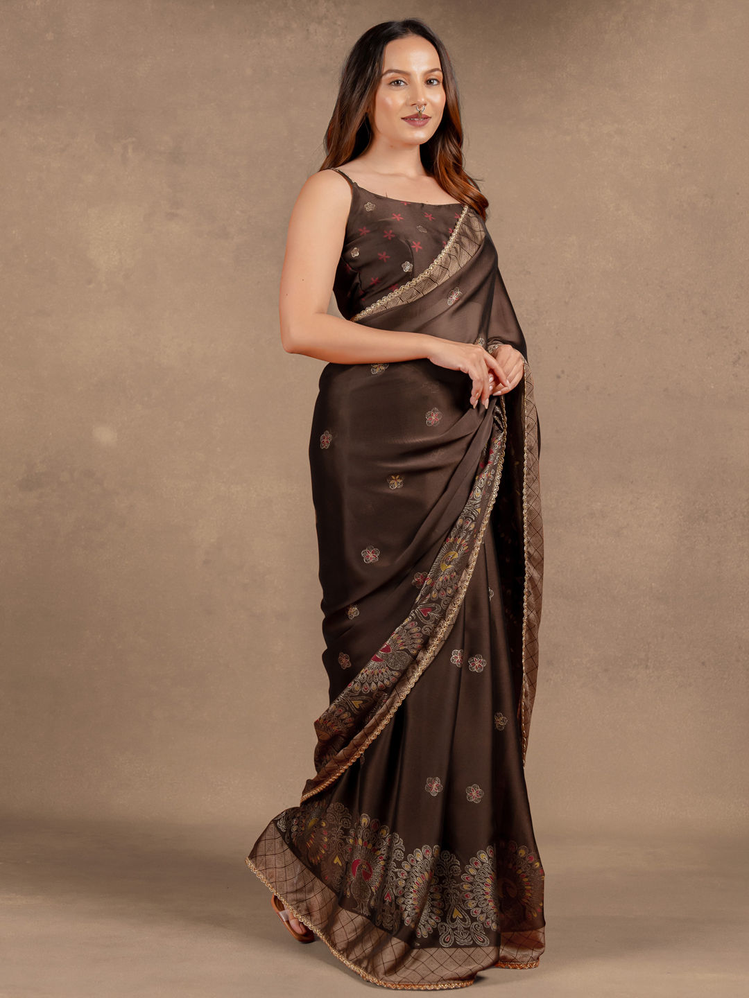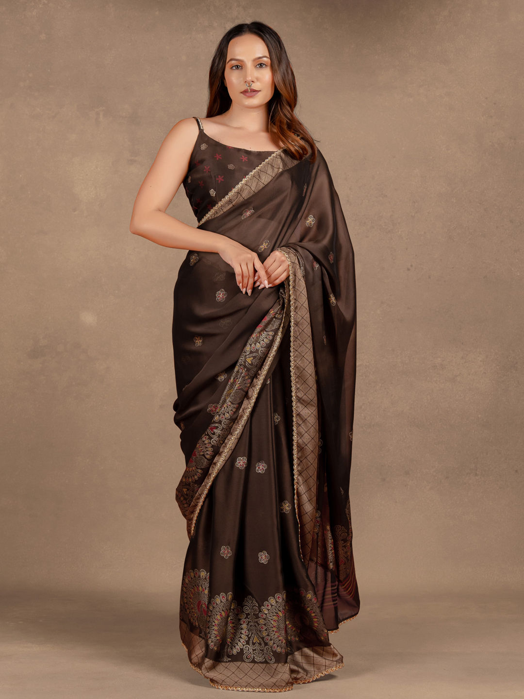 Beige and Brown color Saree in Chiffon fabric with Foil Print work