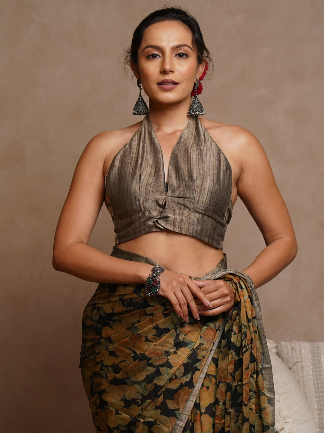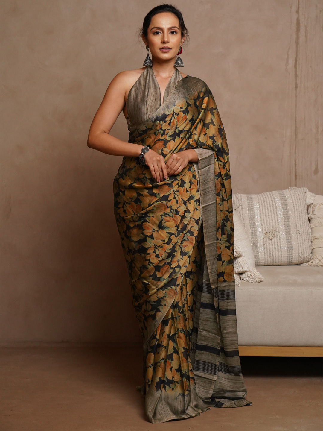 Black and Grey color Saree in Chiffon fabric with Floral, Printed work