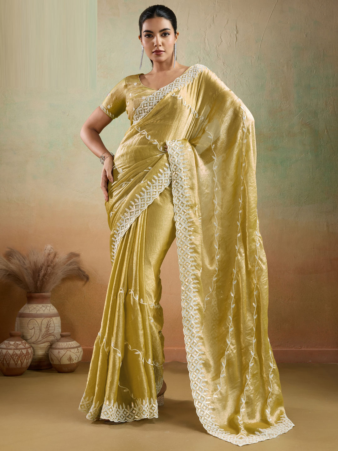 Gold color Saree in Chiffon fabric with Embroidered, Resham, Thread work