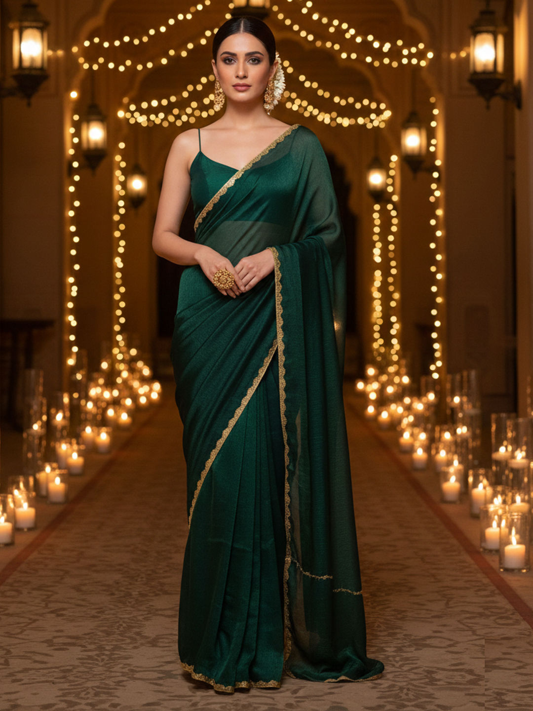 Green color Saree in Chiffon fabric with Bugle Beads, Lace work