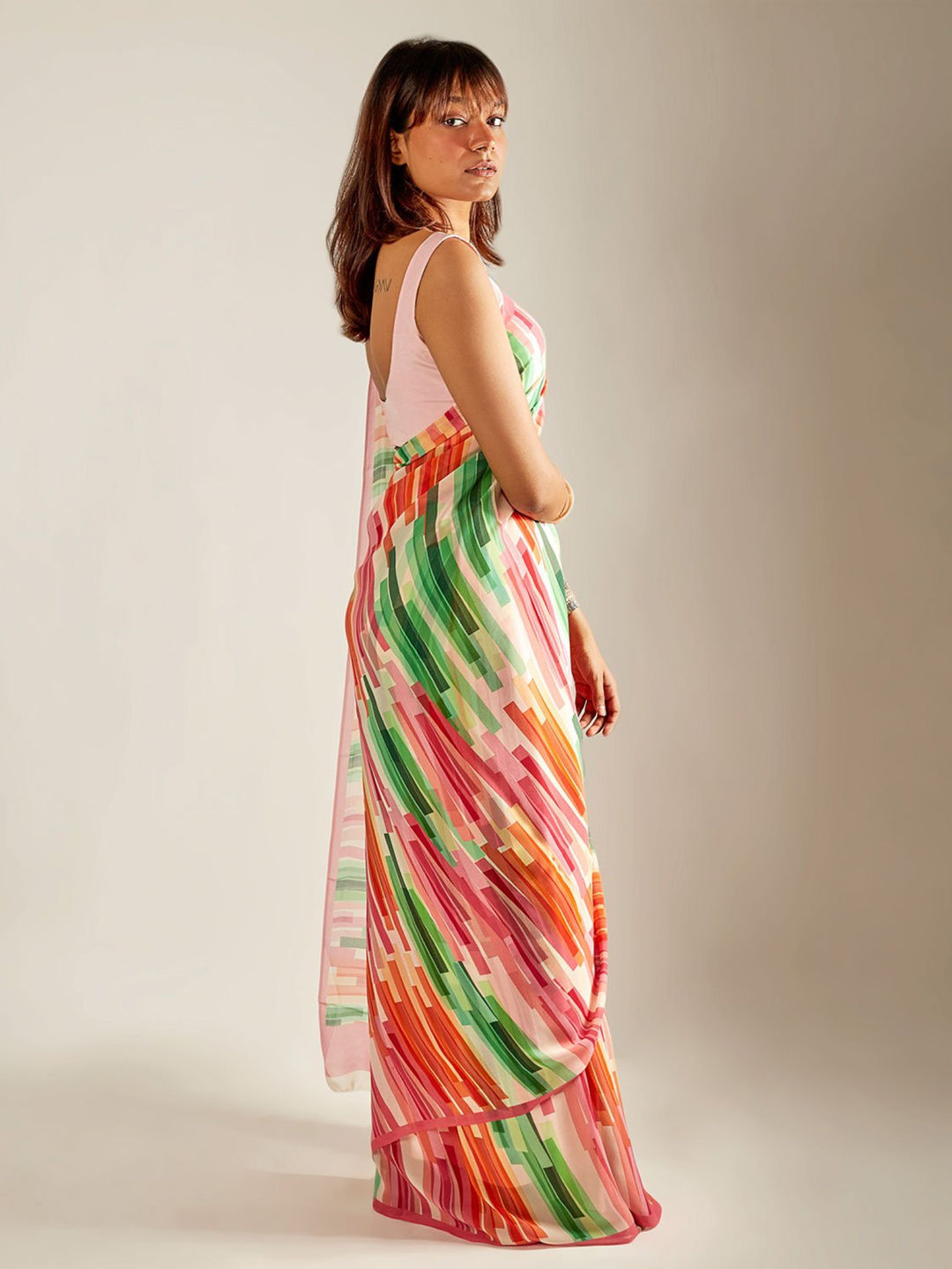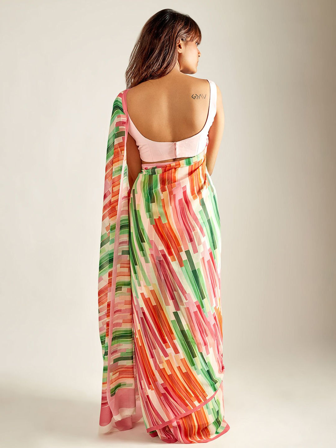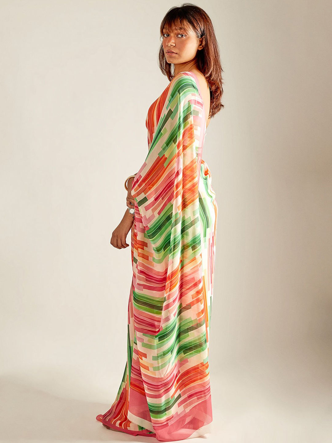 Green, Orange color Saree in Chiffon fabric with Printed work