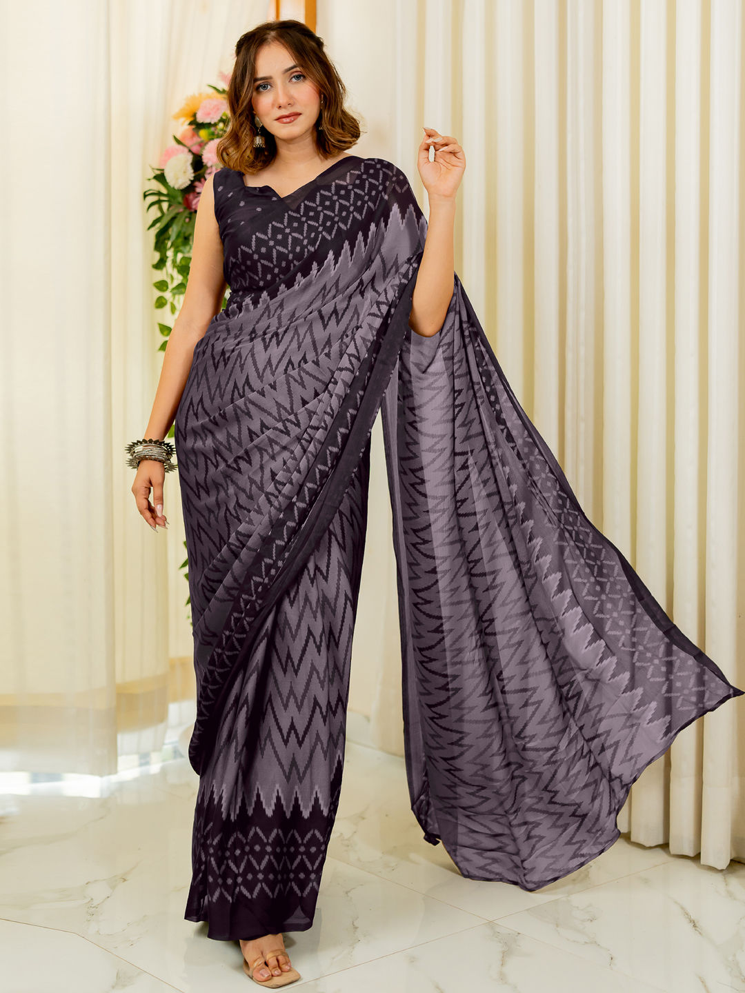 Chiffon Party Wear Saree in Black and Grey with Printed work