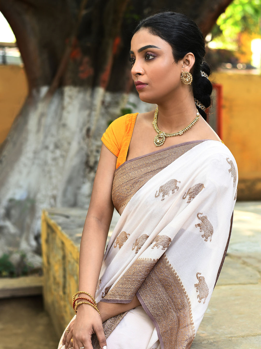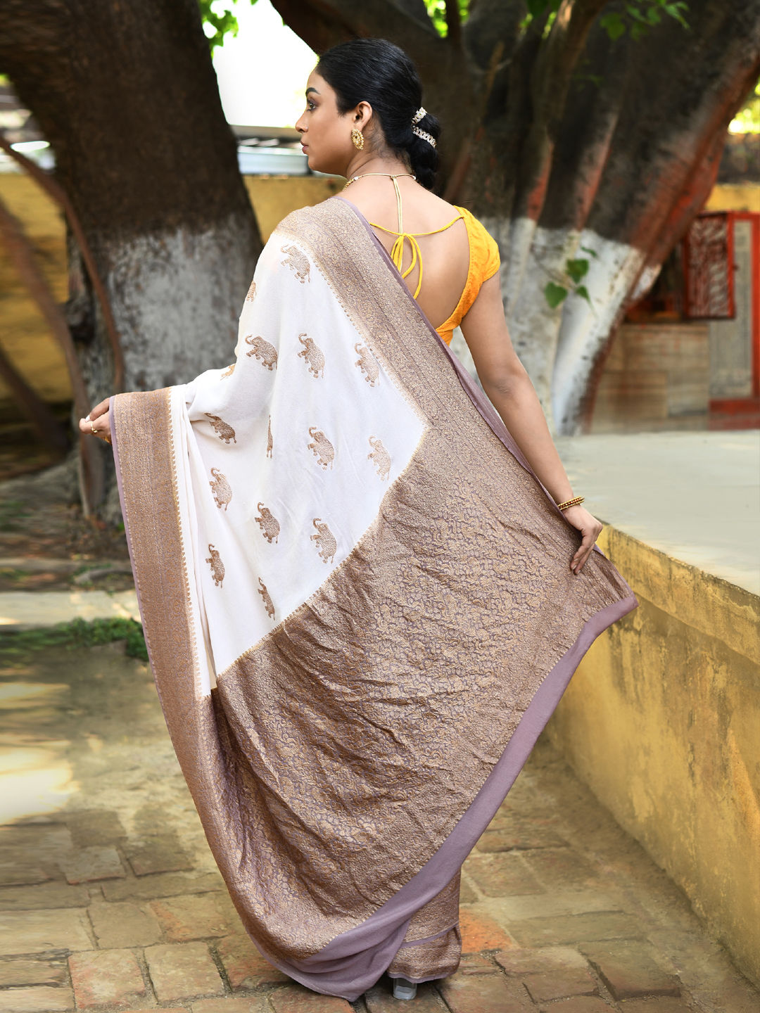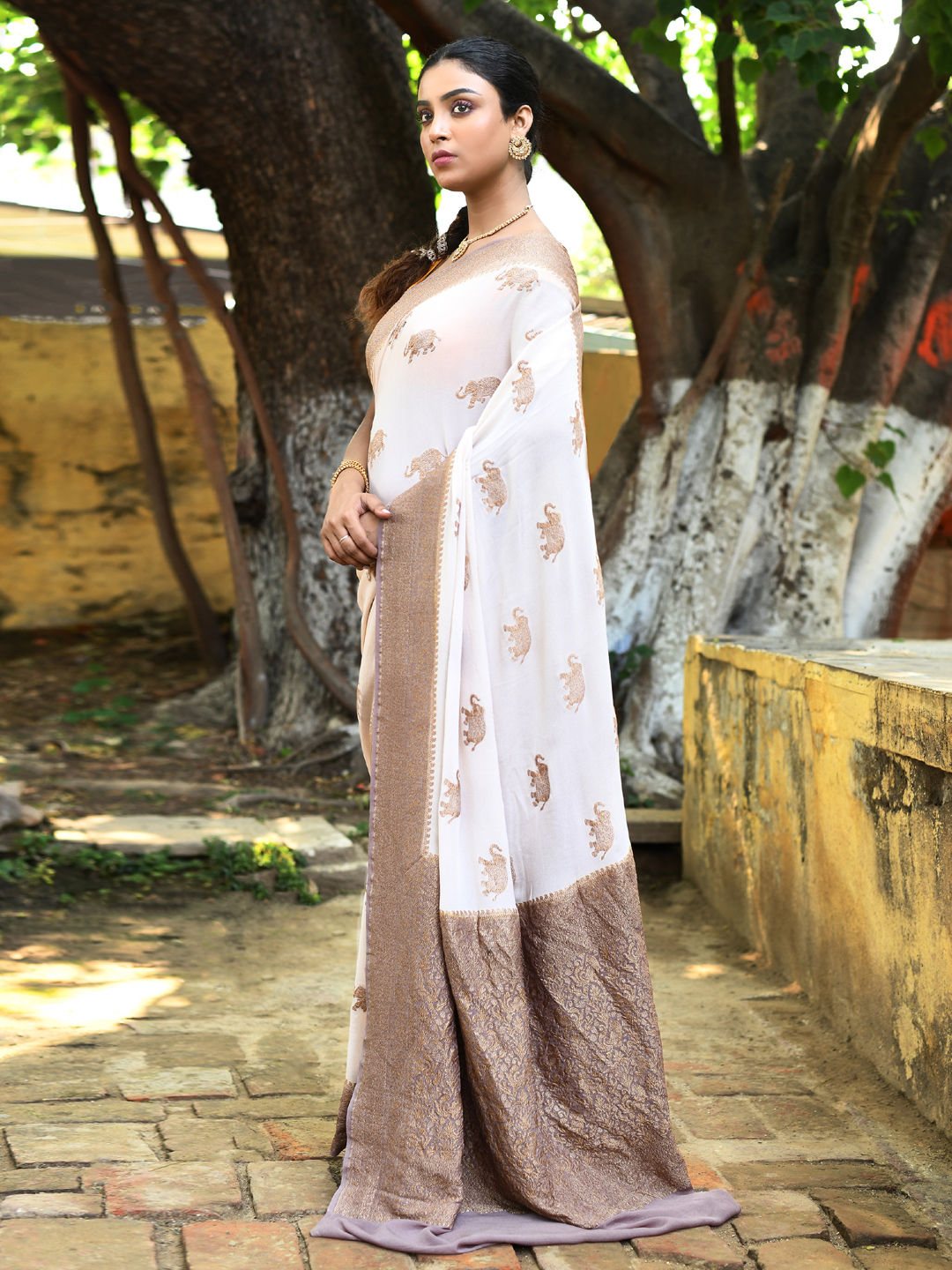 White and Off White color Saree in Chiffon, Crepe Silk fabric with Border, Zari work