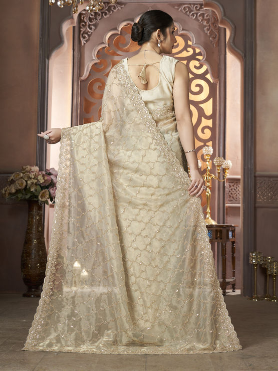 White and Off White color Saree in Chiffon fabric with Bugle Beads, Sequence work
