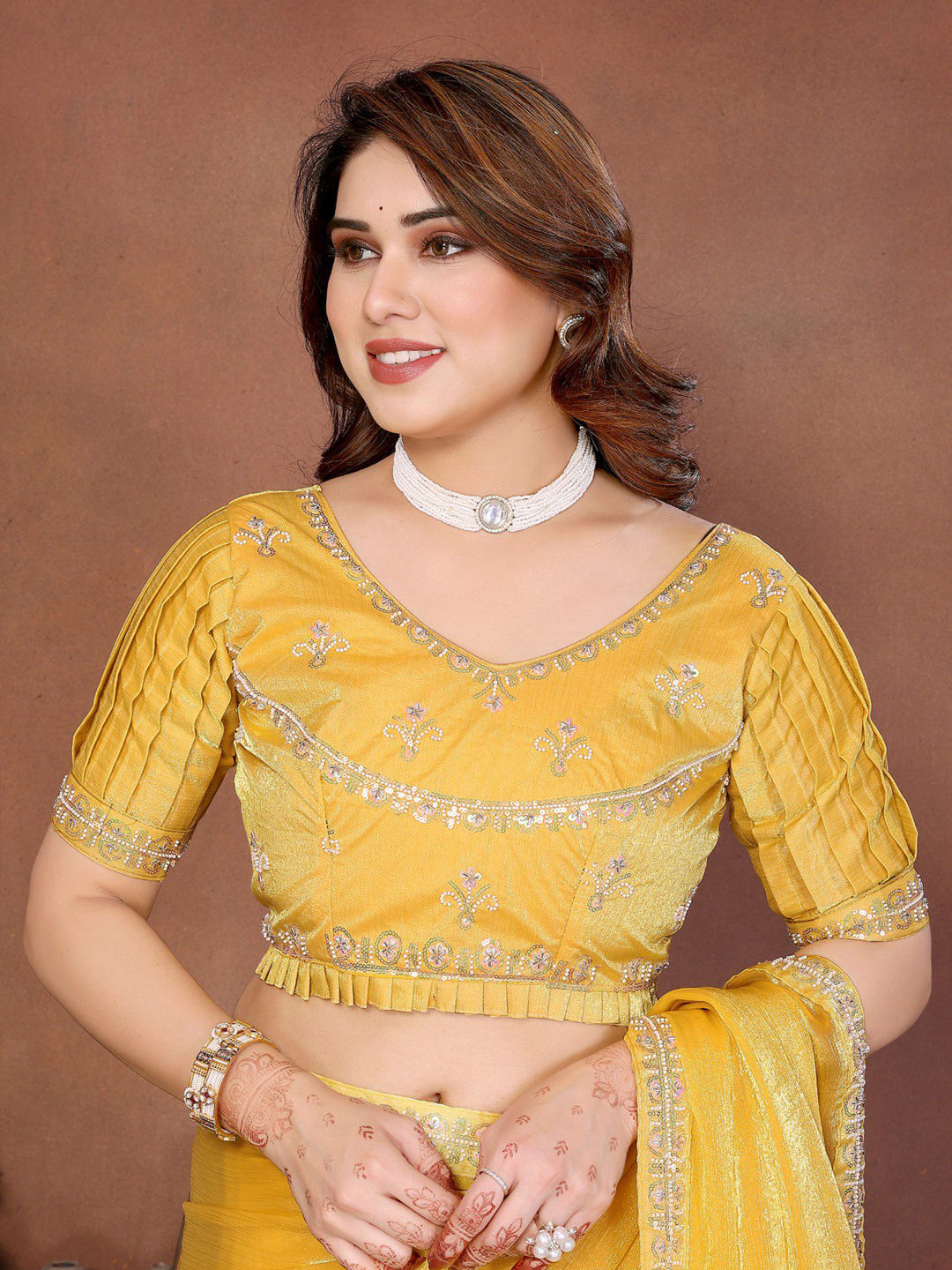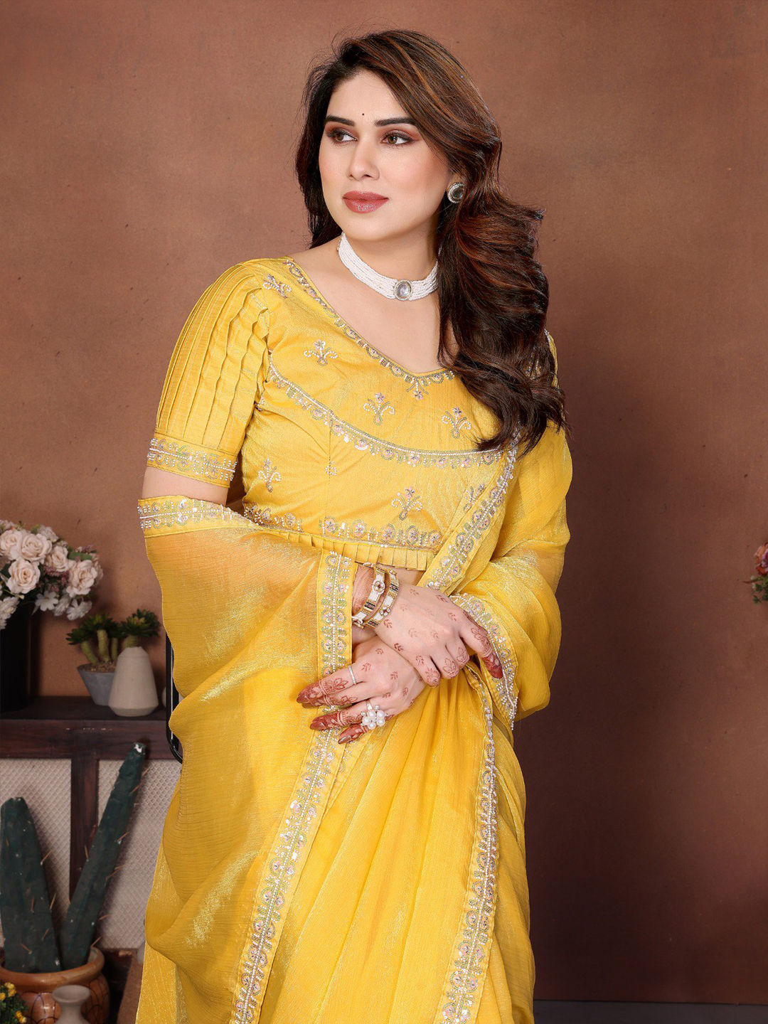 Yellow color Saree in Chiffon fabric with Embroidered, Lace work