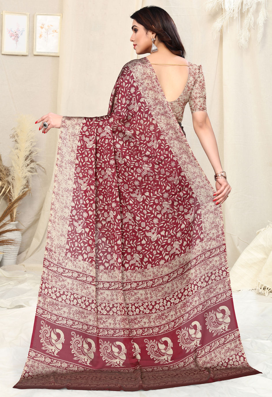 Red and Maroon color Saree in Chiffon fabric with Printed work
