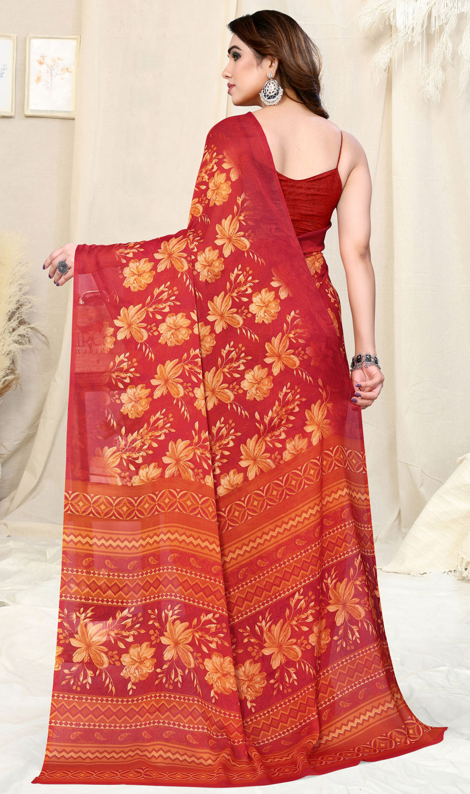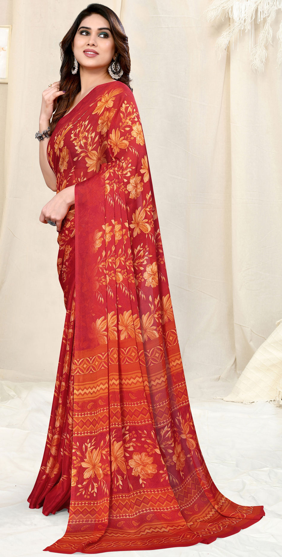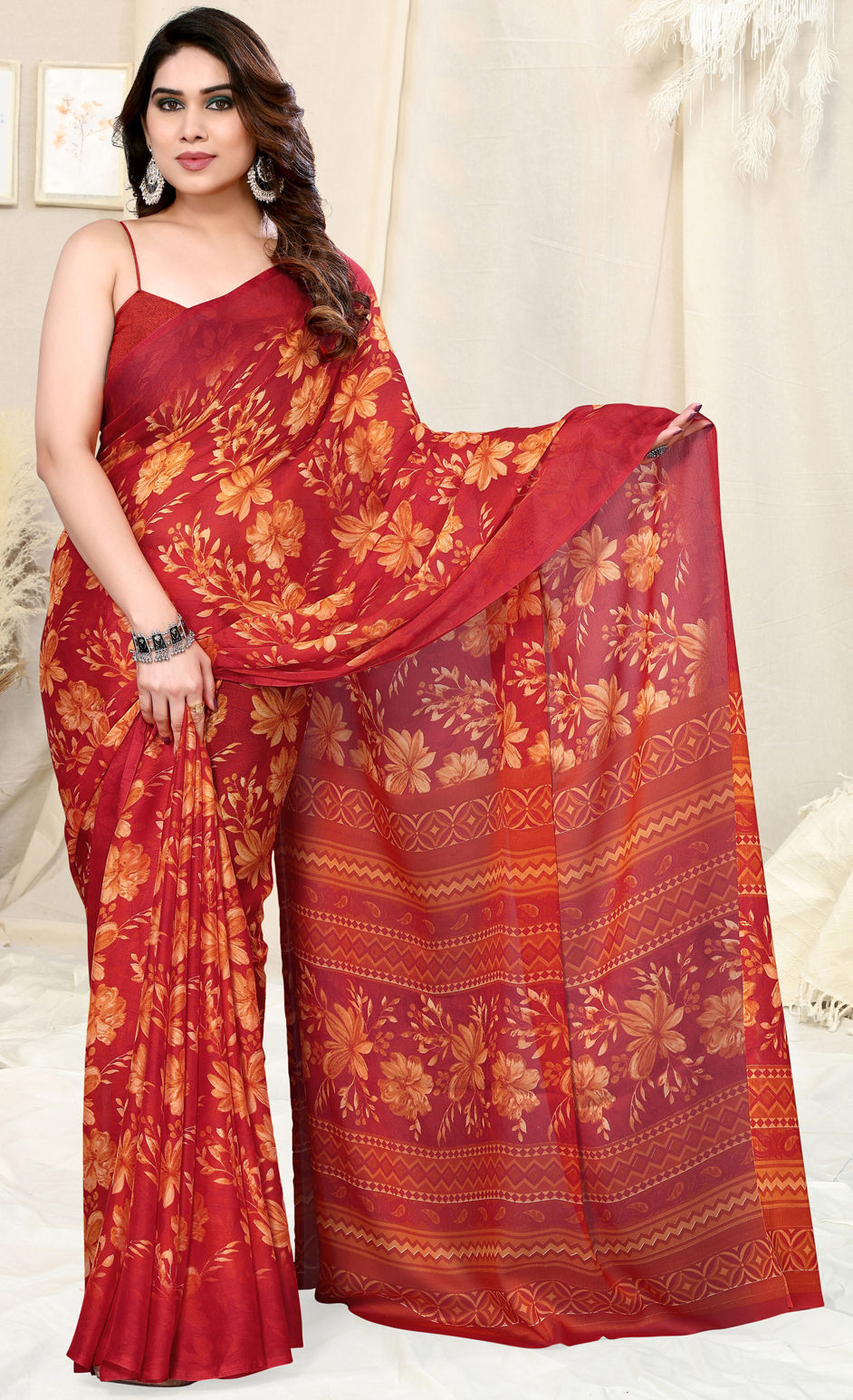 Chiffon Festive Saree in Red and Maroon with Floral work
