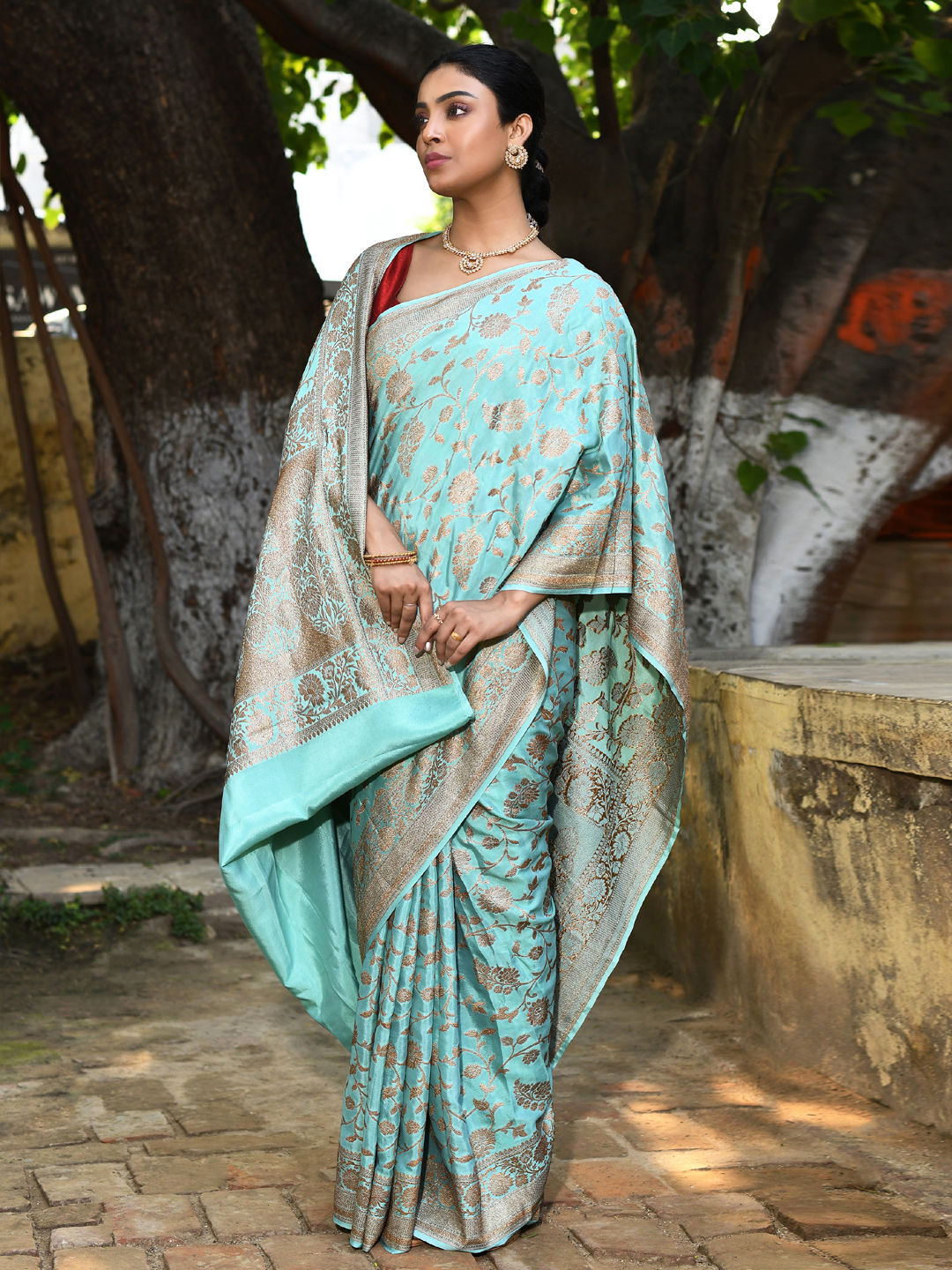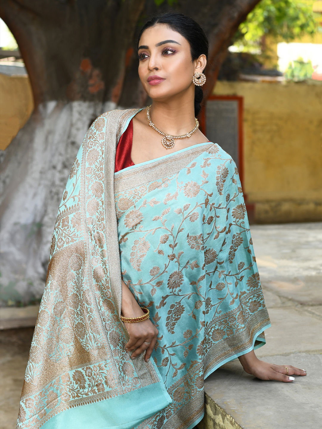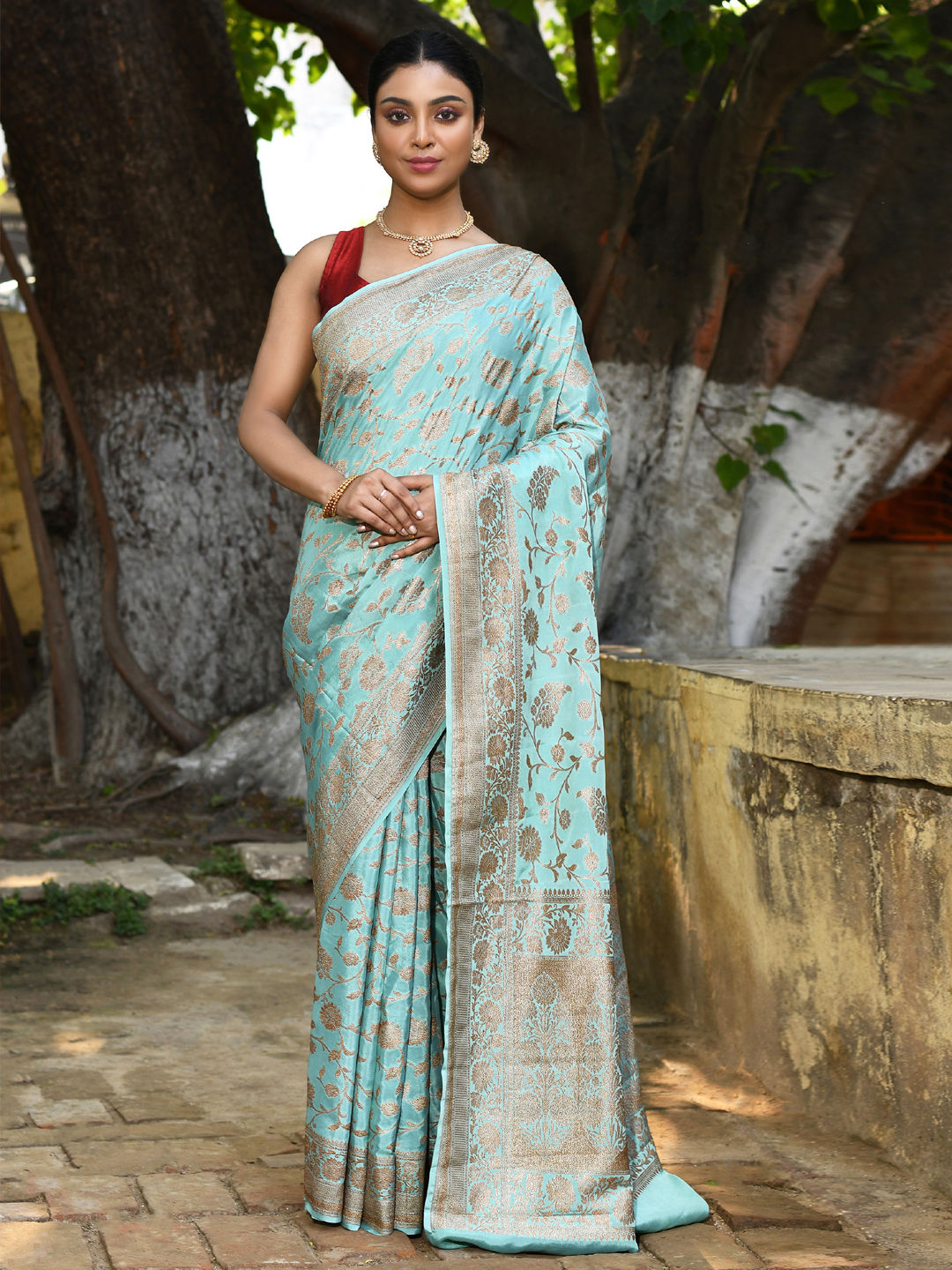 Blue color Saree in Chiffon, Crepe Silk fabric with Border, Zari work
