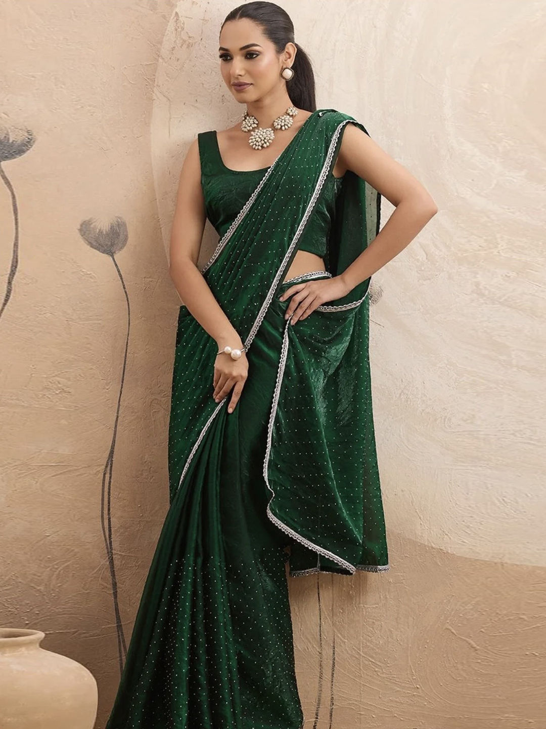 Green color Saree in Chiffon fabric with Lace, Stone work