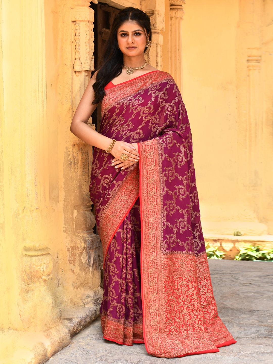 Chiffon Festive Saree in Pink and Majenta with Border work
