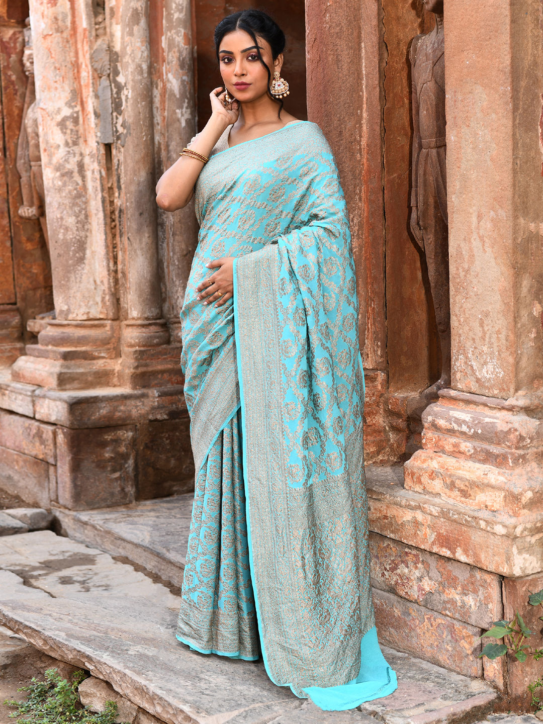 Green color Saree in Chiffon, Crepe Silk fabric with Border, Zari work