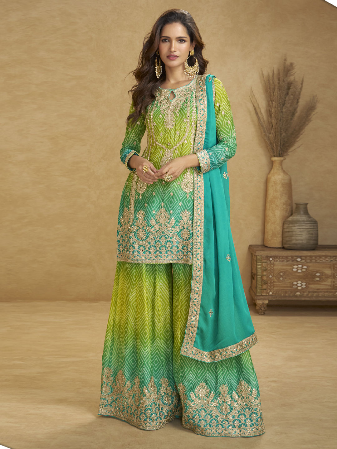 Green color Salwar Kameez in Chinon Silk fabric with Bandhej, Embroidered, Mirror, Printed, Sequence work