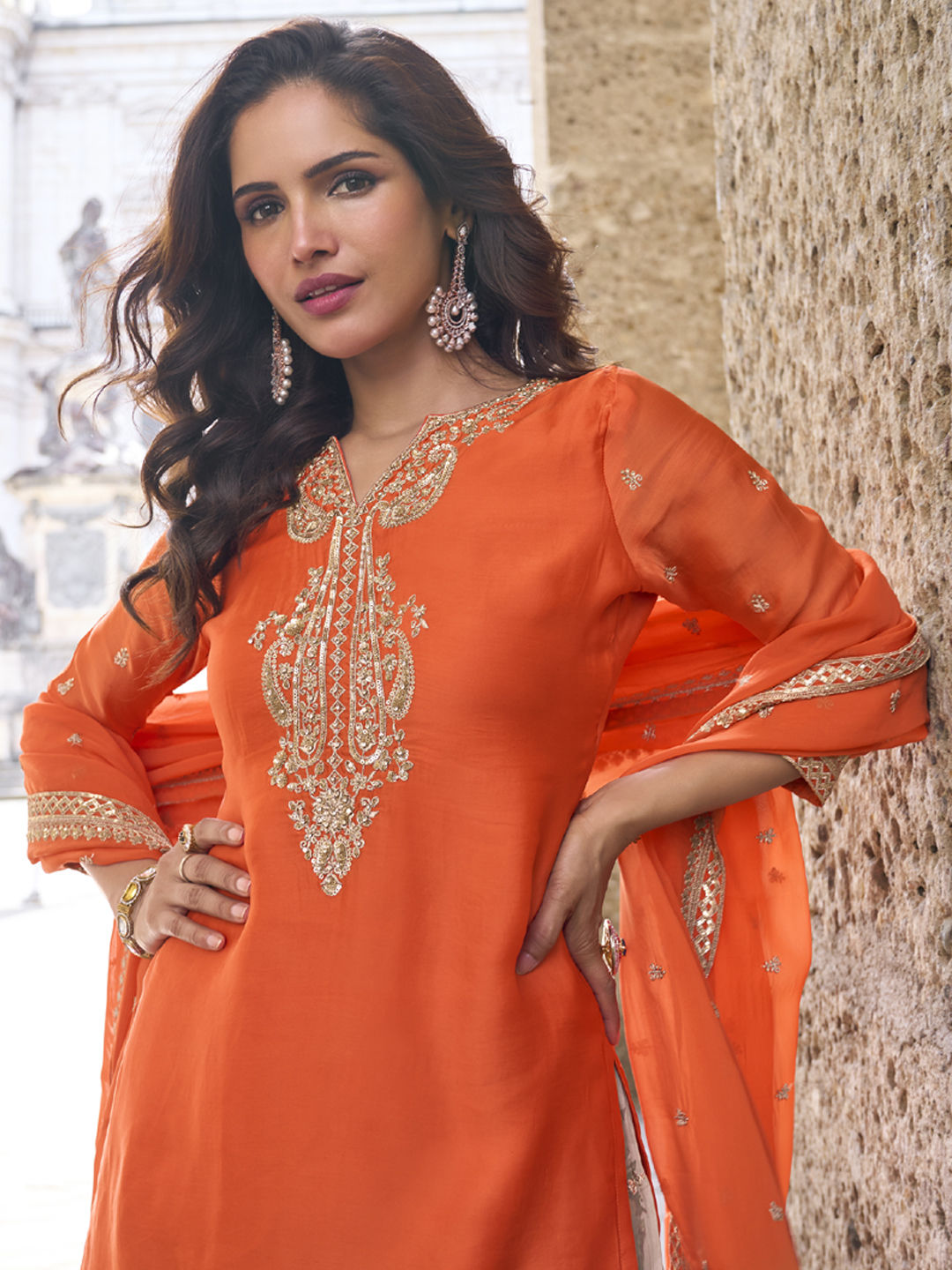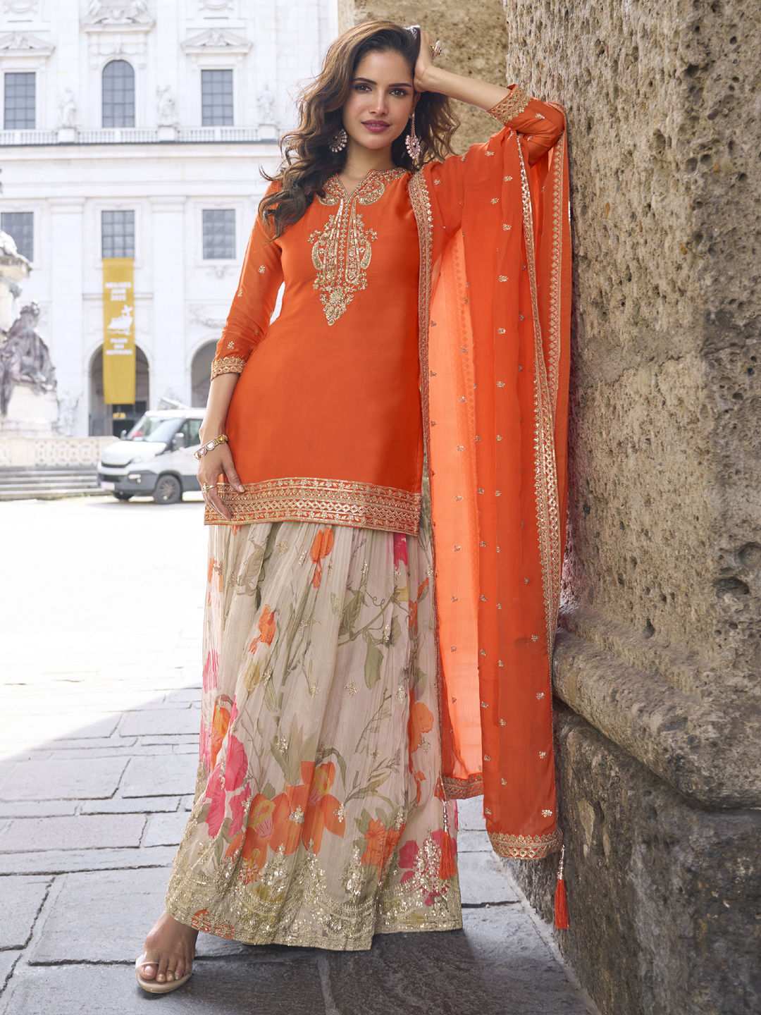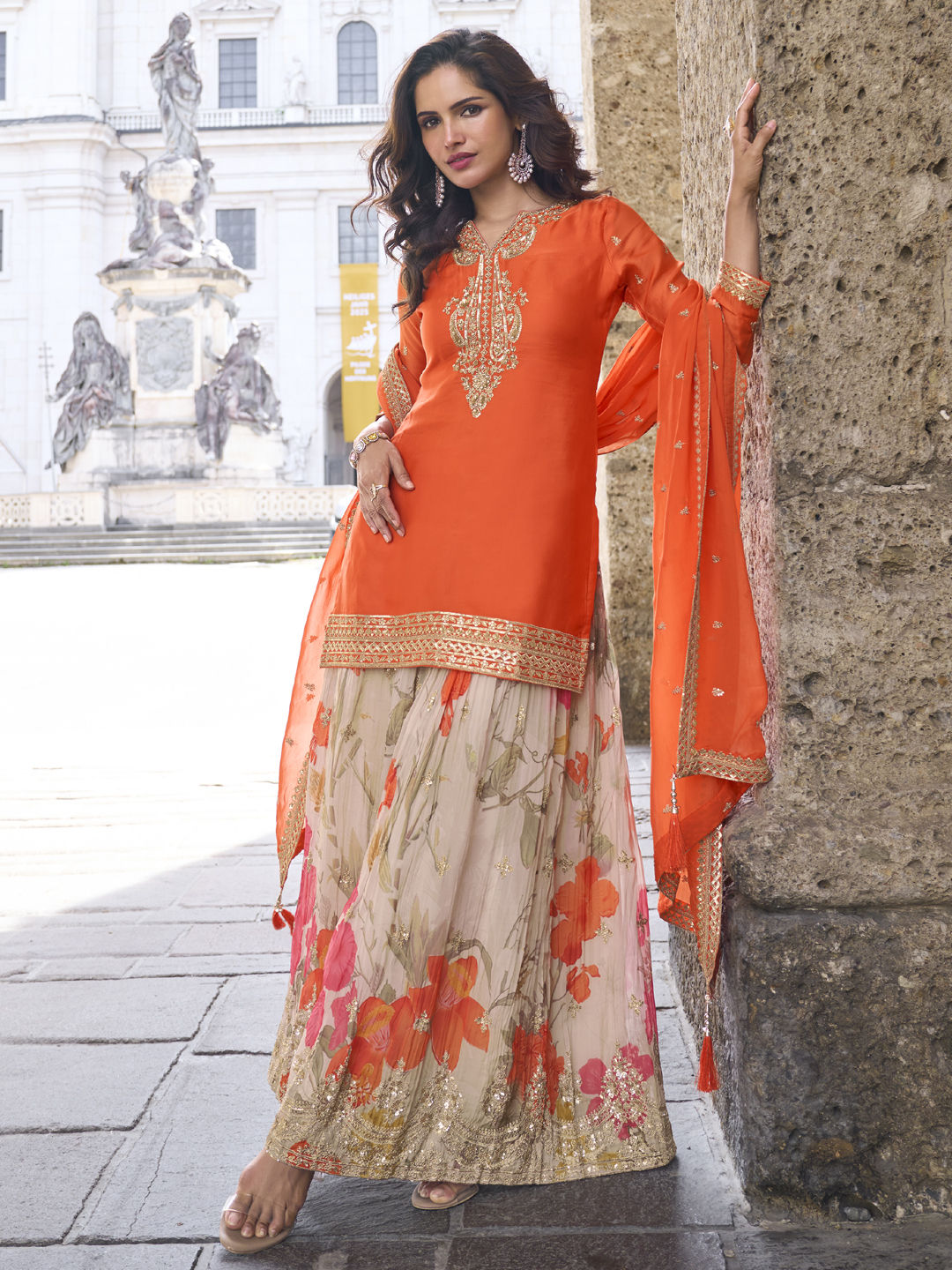 Orange color Salwar Kameez in Chinon Silk fabric with Embroidered, Floral, Printed, Sequence work