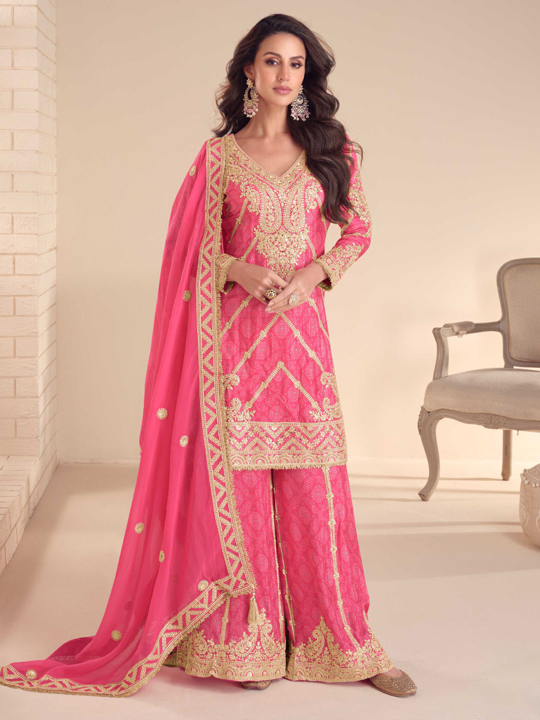Pink and Majenta color Salwar Kameez in Chinon Silk fabric with Digital Print, Embroidered, Mirror, Sequence, Zari work