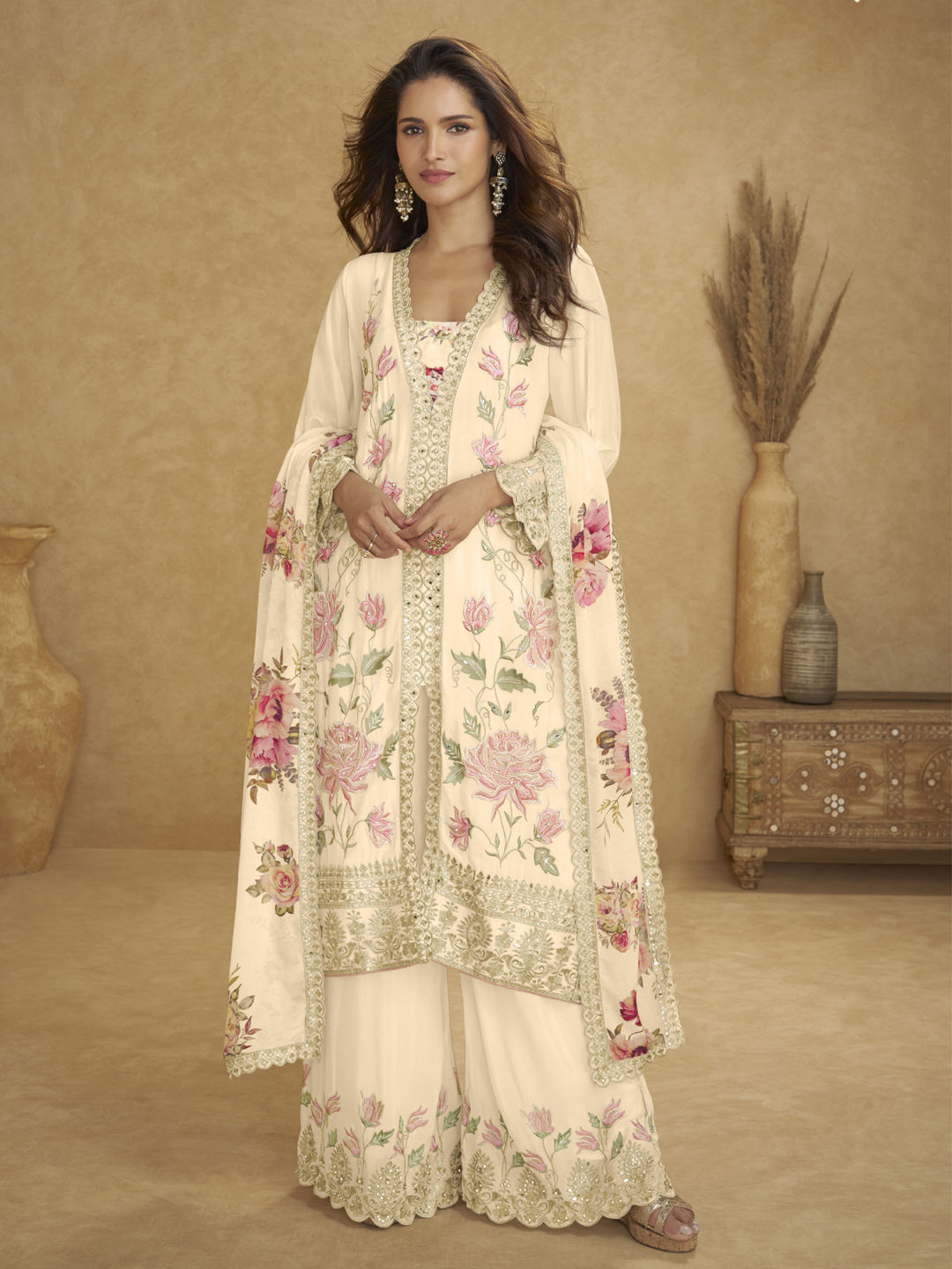 in White and Off White with Embroidered work