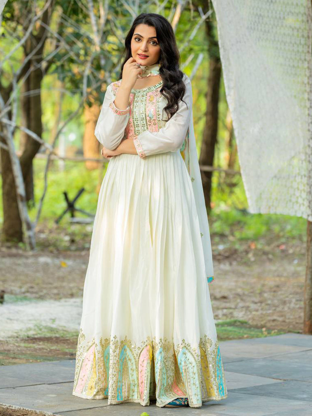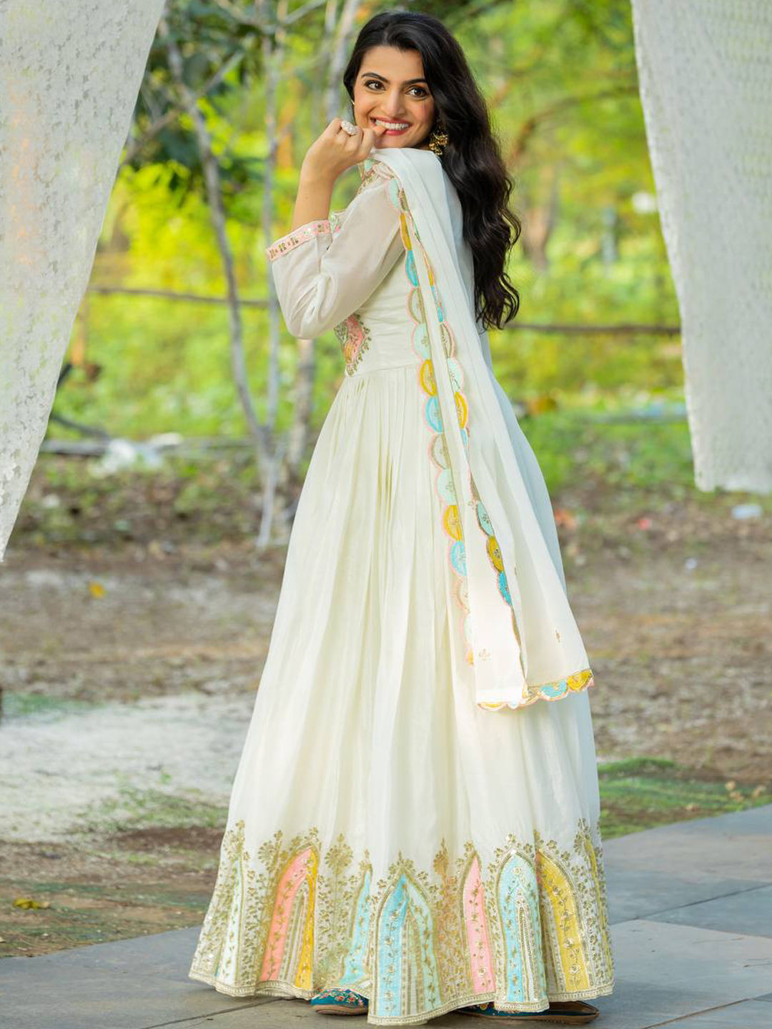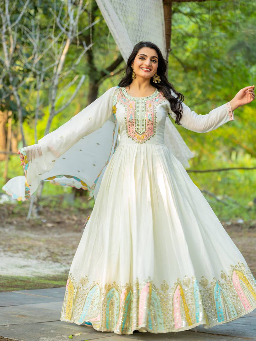 White and Off White color Gown in Chinon Silk fabric with Patch, Sequence work