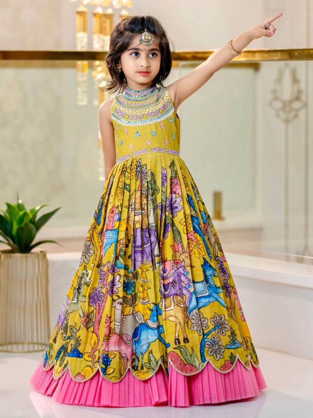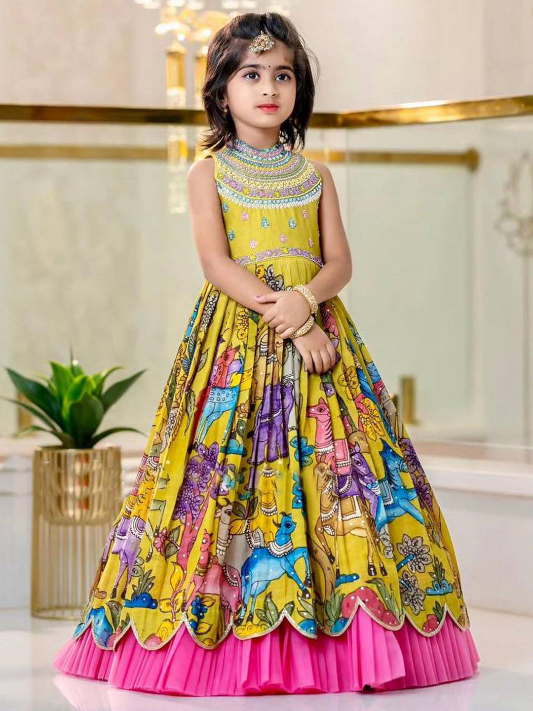 Yellow color Girls Gown in Chinon Silk fabric with Embroidered, Printed, Sequence work