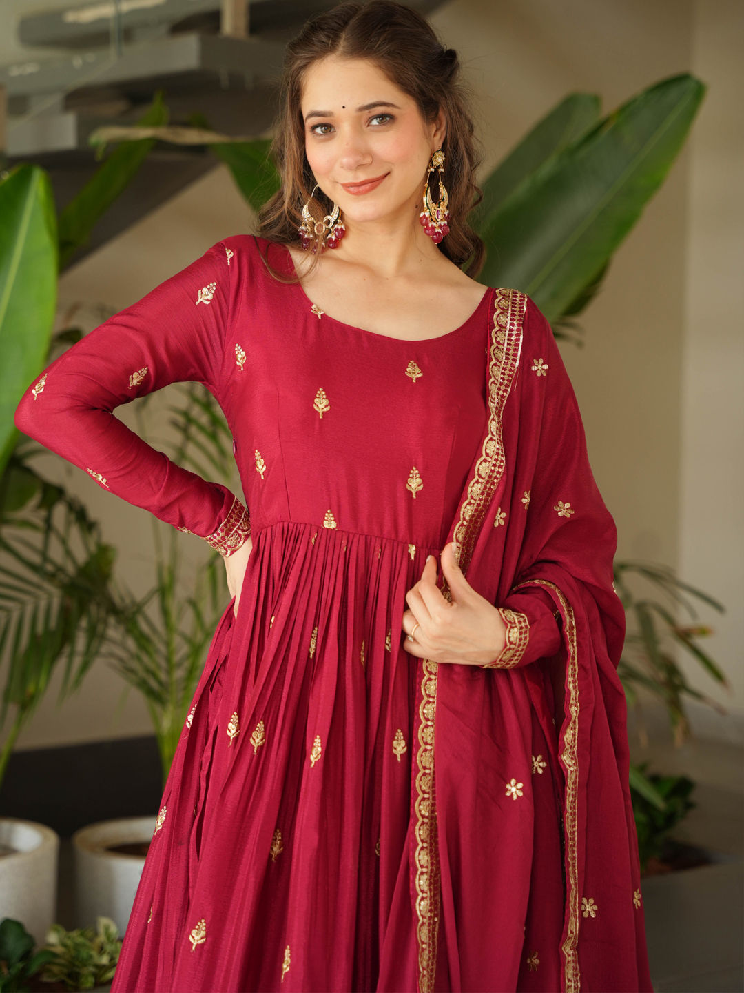 Pink and Majenta color Gown in Chinon Silk fabric with Embroidered, Sequence, Zari work